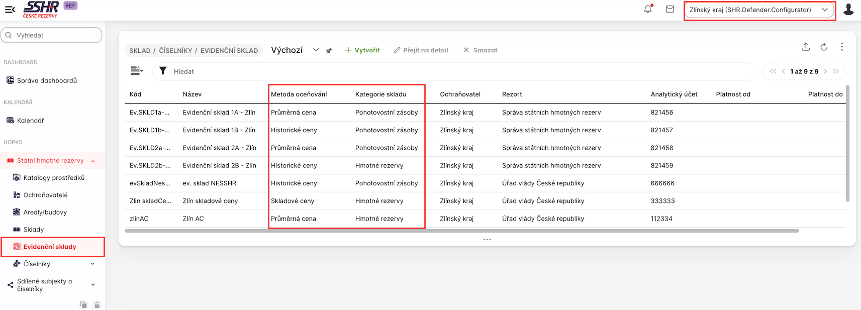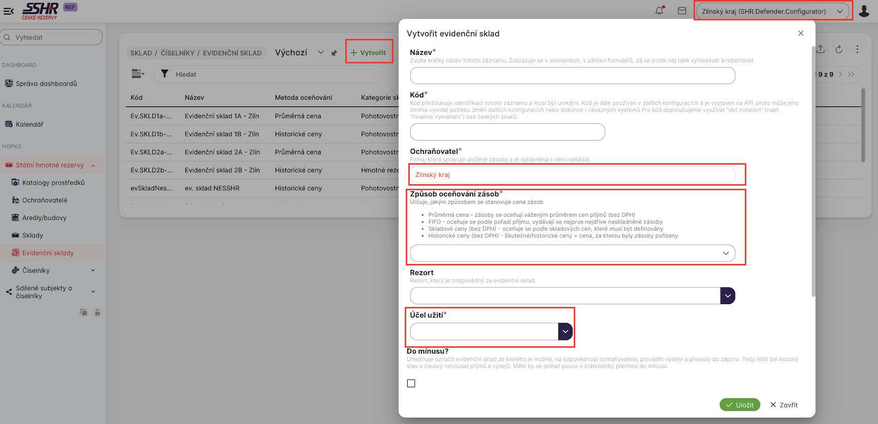 Uživatel s rolí SHR.Defender.Configurator může vytvořit nový evidenční sklad neSHR.