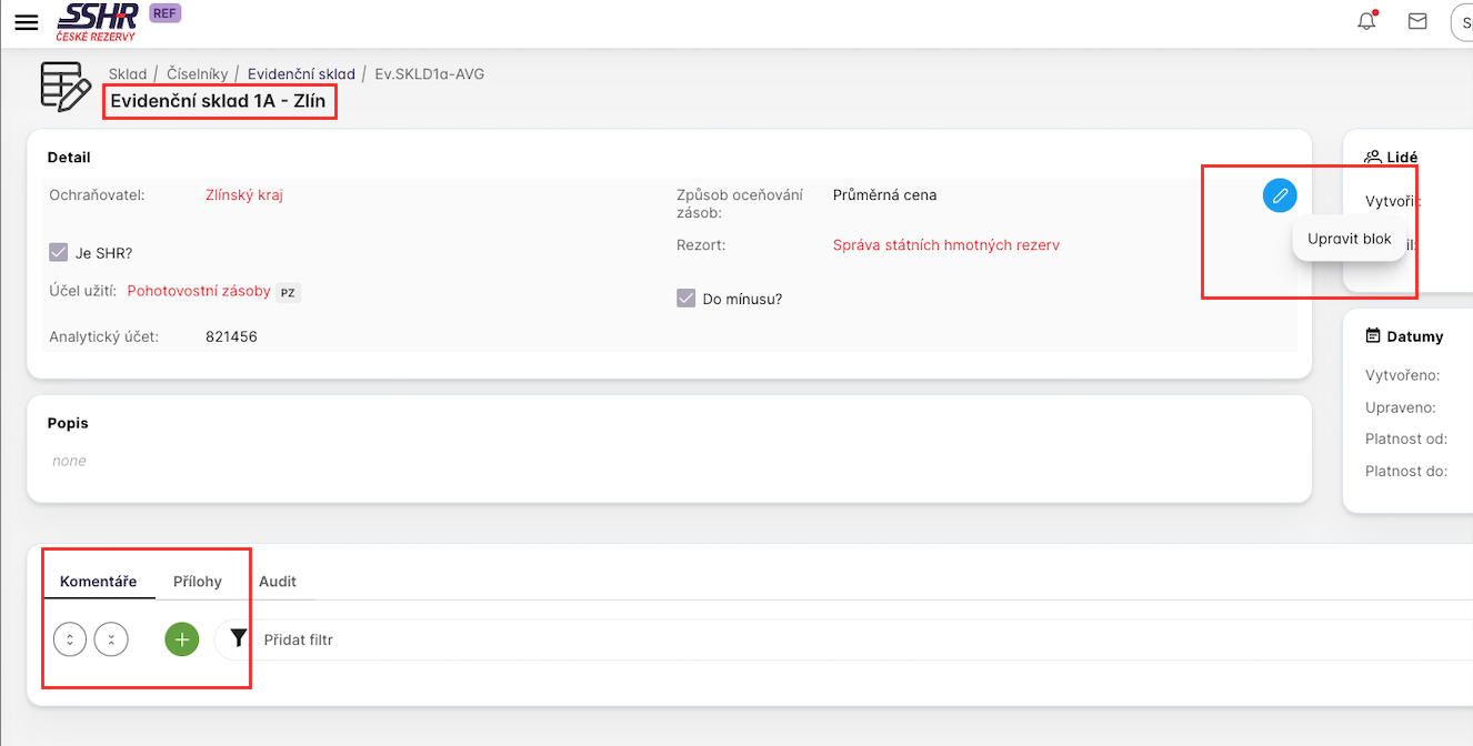 Lidé - základní auditní stopa, kdo evidenční sklad vytvořil a naposledy upravil
