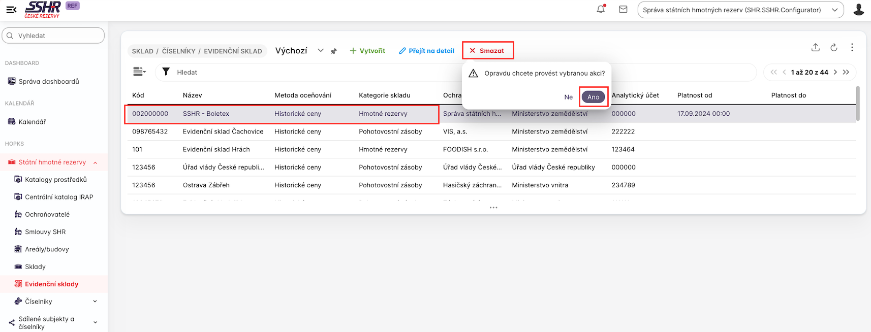 Mazat evidenční sklady SHR může pouze uživatel s rolí SHR.SSHR.Configurator. Na přehledu Evidenční sklad po označení vybraného záznamu, klikne na tlačítko smazat a potvrdí ve vyskakovacím okně zvolenou akci.