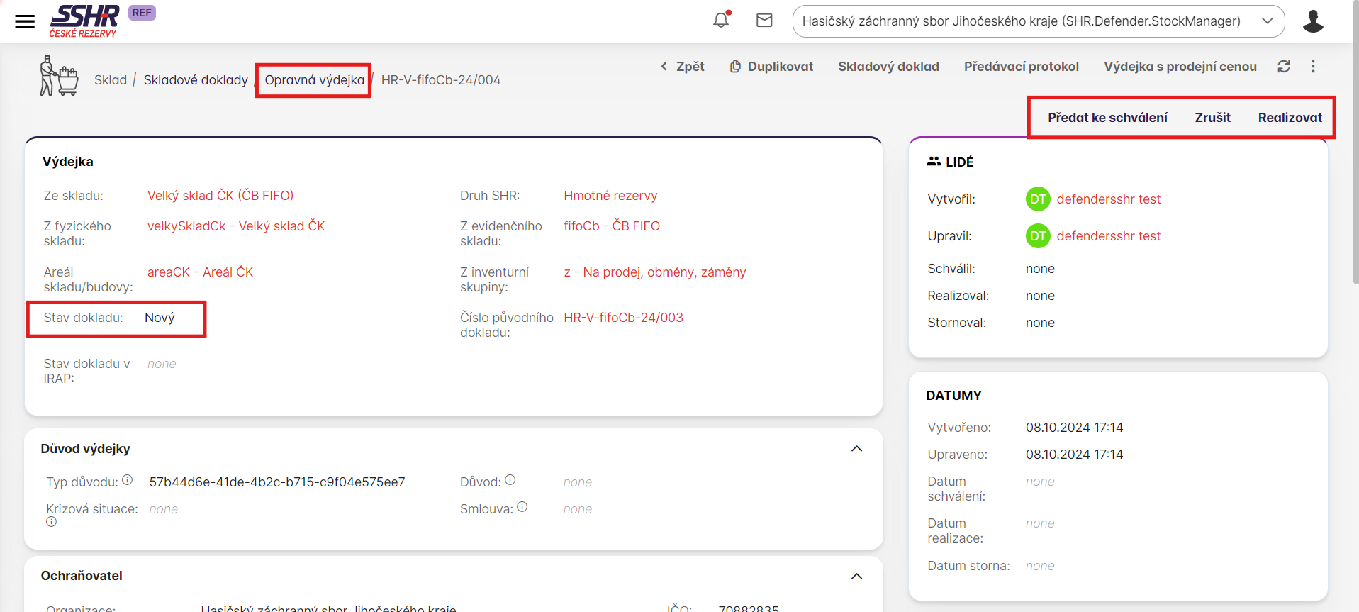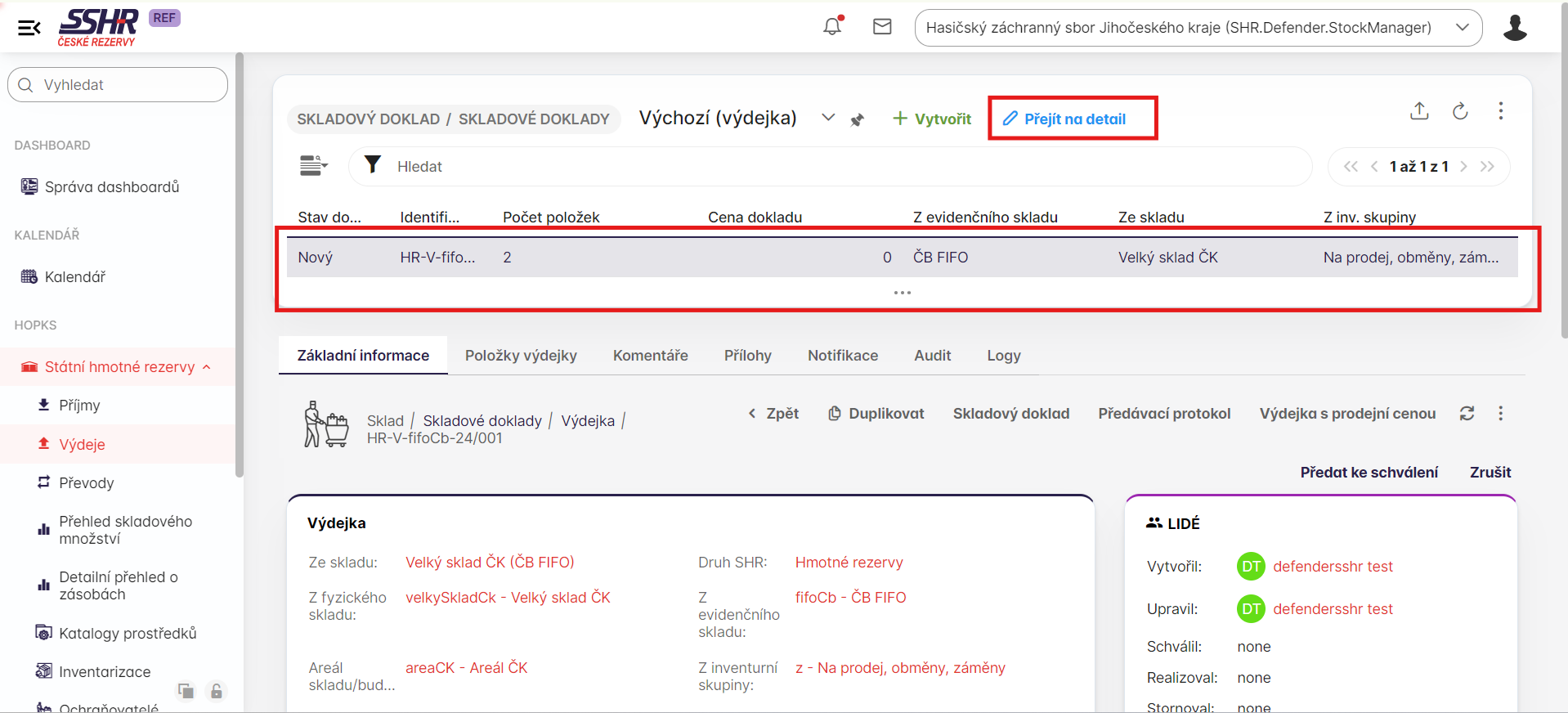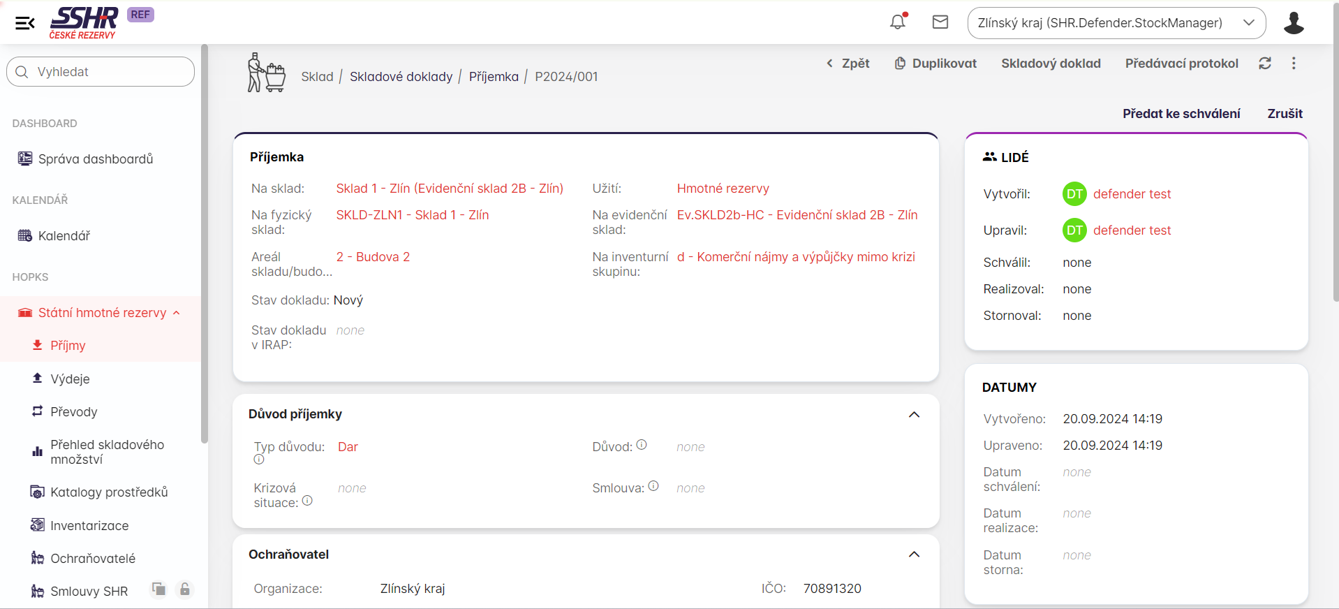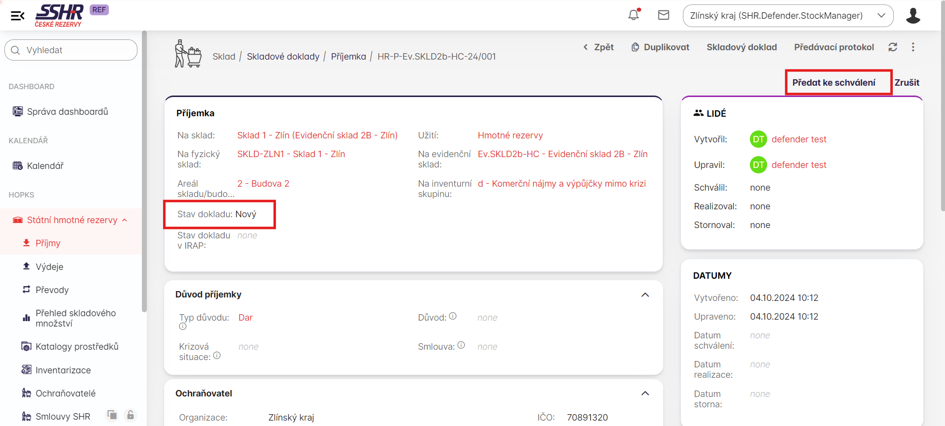 Právě vytvořený doklad přes tlačítko "Vytvořit" bude vždy začínat ve stavu "Nový". Ve stavu "Nový" se uživateli zobrazují tlačítka "Předat ke schválení" a "Zrušit". Tlač ítko "Předat ke schválení" slouží pro roli SHR.Defender.StockOperator v případě změn na detailu dokladu po vytvoření. Doklad je tímto předán ke schválení roli SHR.Defender.StockManager, který zkontroluje změny a učí jejich korektnost. Role SHR.Defender.StockManager má možnost použít tlačítko "Předat ke schválení" pro situaci, ve které by nebyl SHR.Defender.StockOperator zapotřebí.