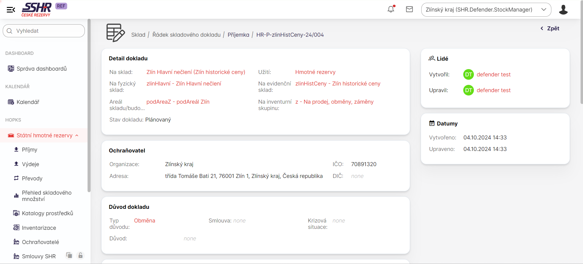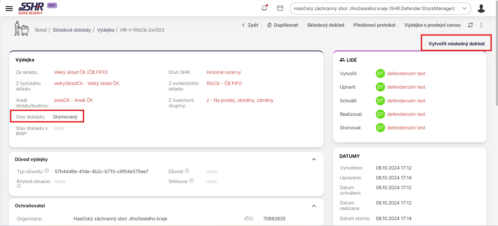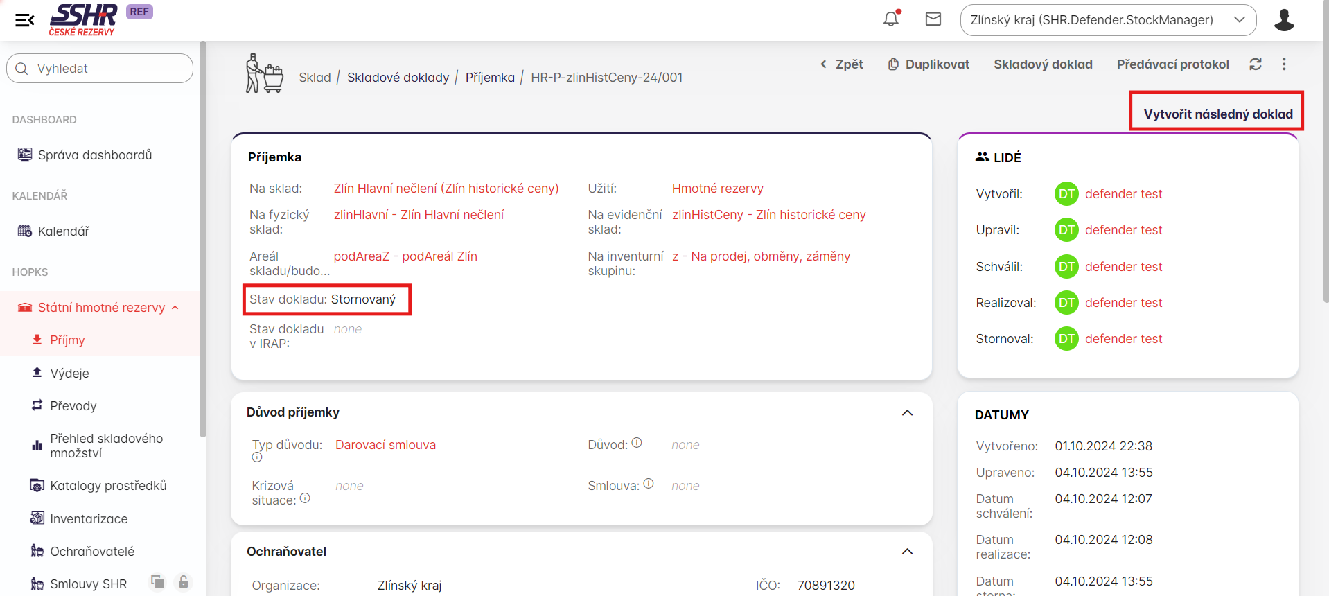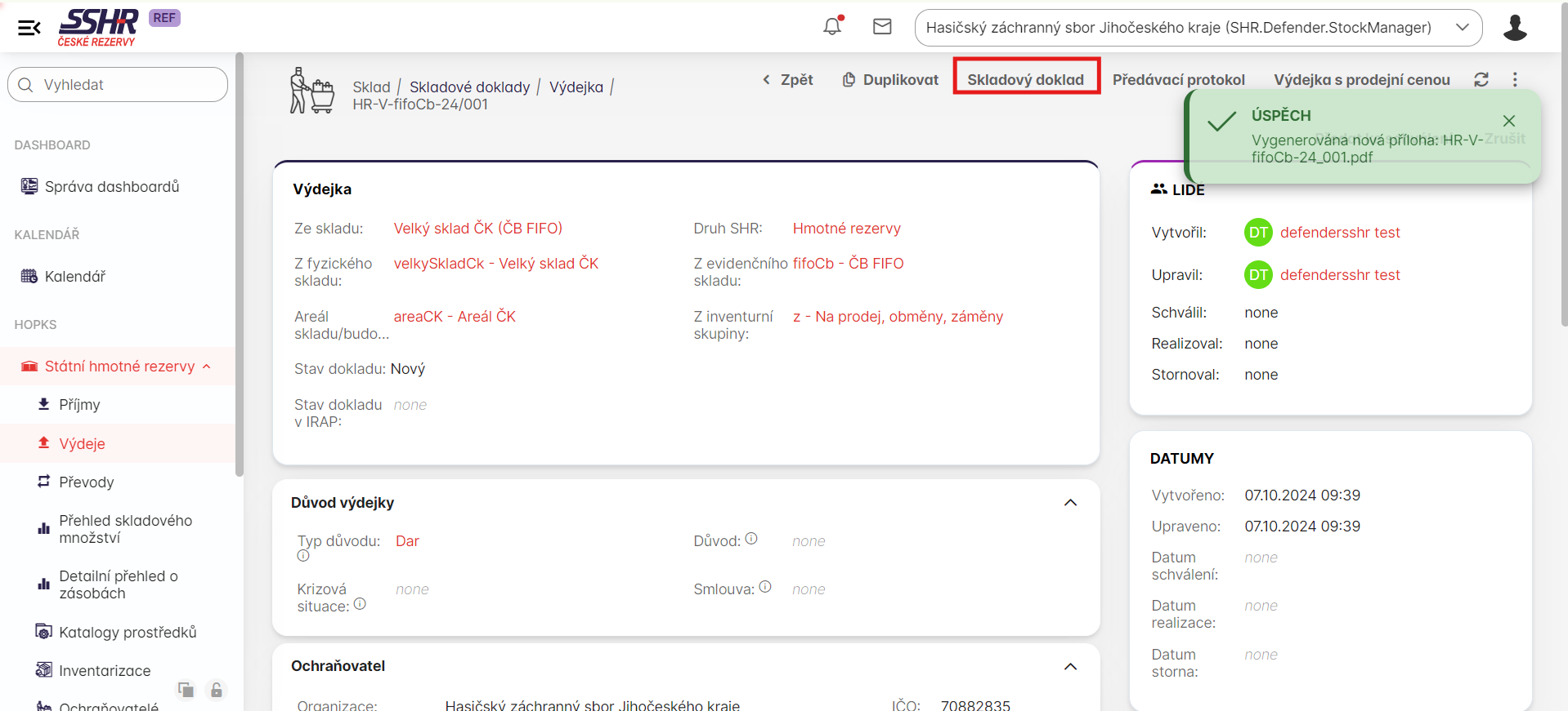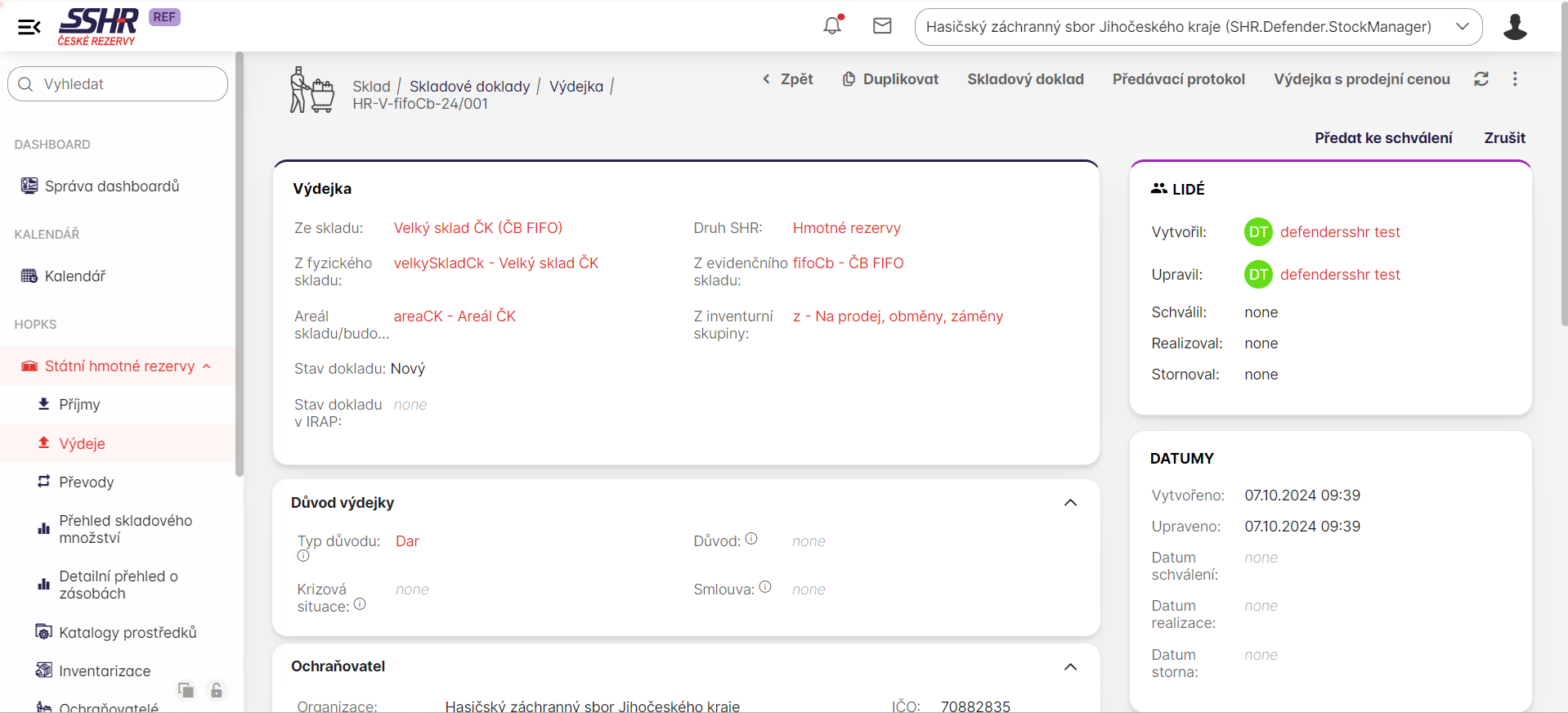 Právě vytvořený doklad přes tlačítko "Vytvořit" bude vždy začínat ve stavu "Nový". Ve stavu "Nový" se uživateli zobrazují tlačítka "Předat ke schválení" a "Zrušit". Tlač ítko "Předat ke schválení" slouží pro roli SHR.Defender.StockOperator v případě změn na detailu dokladu po vytvoření. Doklad je tímto předán ke schválení roli SHR.Defender.StockManager, který zkontroluje změny a učí jejich korektnost. Role SHR.Defender.StockManager má možnost použít tlačítko "Předat ke schválení" pro situaci, ve které by nebyl SHR.Defender.StockOperator zapotřebí.