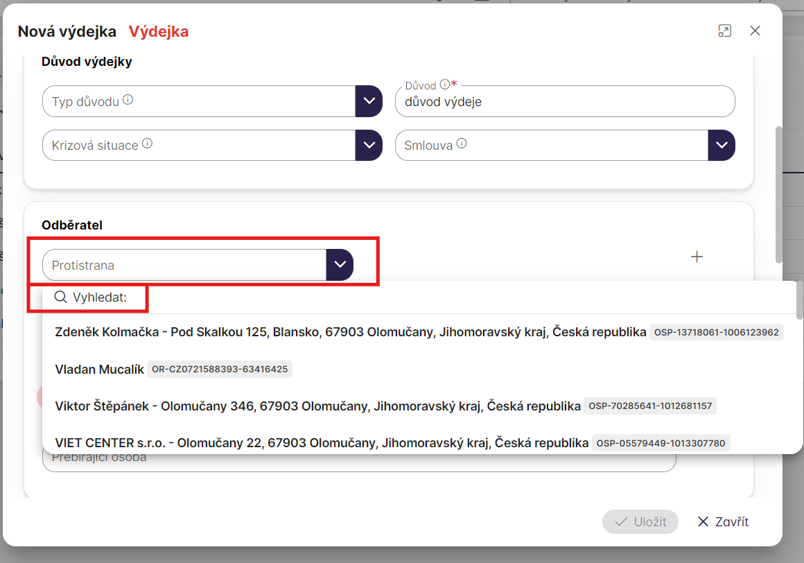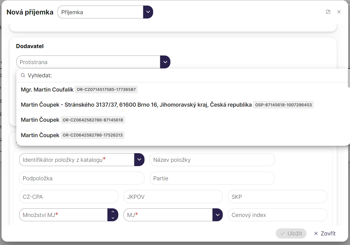 - Pole "Dodavatel" - Kliknutím do pole "Protistrana" se zobrazí list dodavatelů. Psaní do pole se vám bude výběr dodavatelů filtrovat. Vybráním na požadovaného dodavatele se zbylá pole automaticky vyplní podle informací vybraného dodavatele.