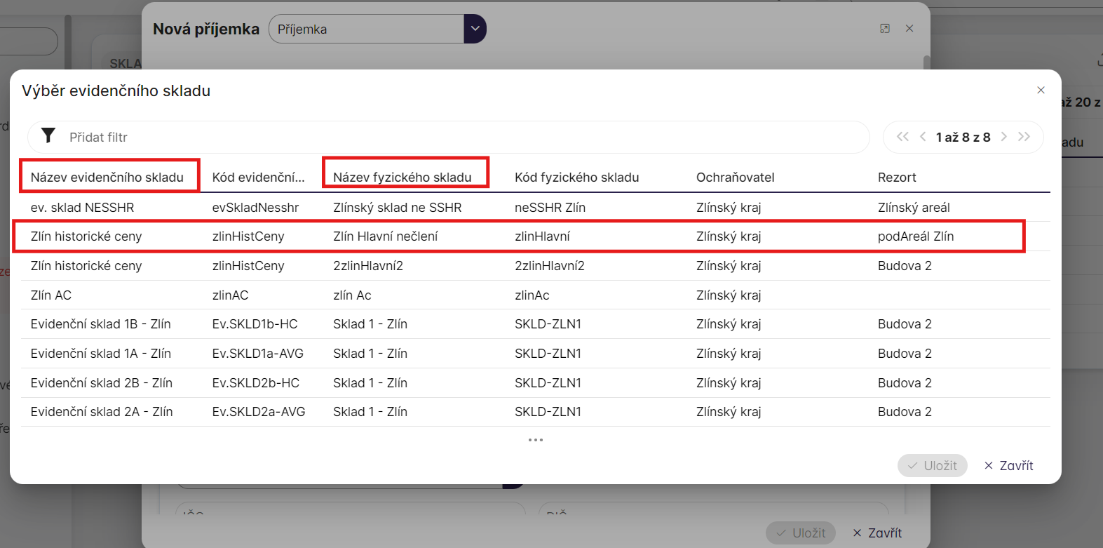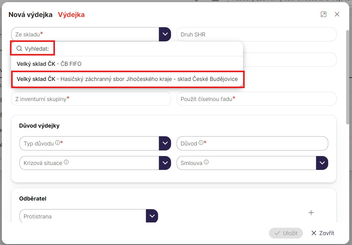 - Pole "Ze skladu" - Do pole "Ze skladu" se vybírá záznam odpovídající vazby mezi fyzickým a evidenčním skladem. Záznam je možné vybrat buď z roletky často používaných záznamů, která se zobrazí při kliknutí do pole, nebo z tabulky záznamů. Pro zobrazení tabulky záznamů je třeba kliknout na lupičku s popisem "Vyhledat" z roletky.