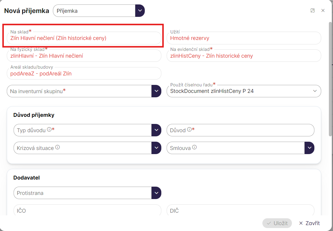 Zbylá pole (Na fyzický sklad, Užití, Na evidenční sklad, Areály skladu/budovy) se doplní automaticky na základě vybrané kombinace skladů.
