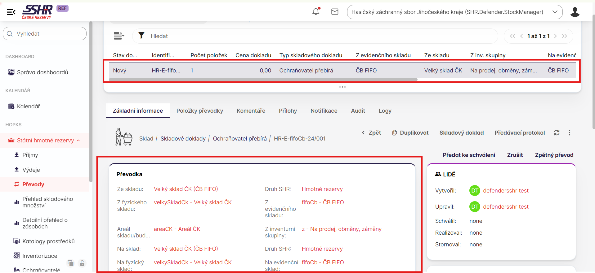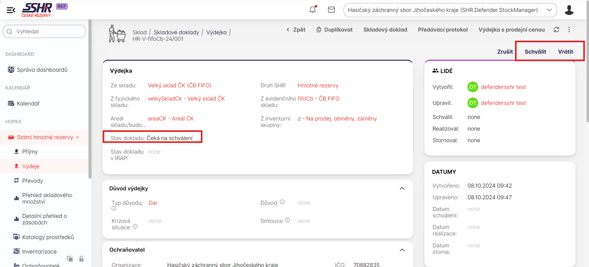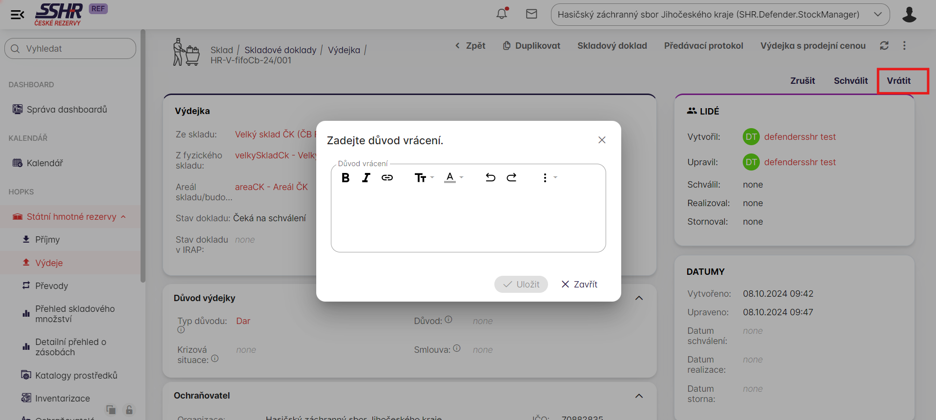Kliknutím na "Uložit" se změní stav dokladu na "Vrácený", roli SHR.Defender.StockOperator se opět zobrazí tlačítko "Předat ke schválení" a poznámka se mu zobrazí v pravé horní části obrazovky v notifikacích. (Zvoneček)