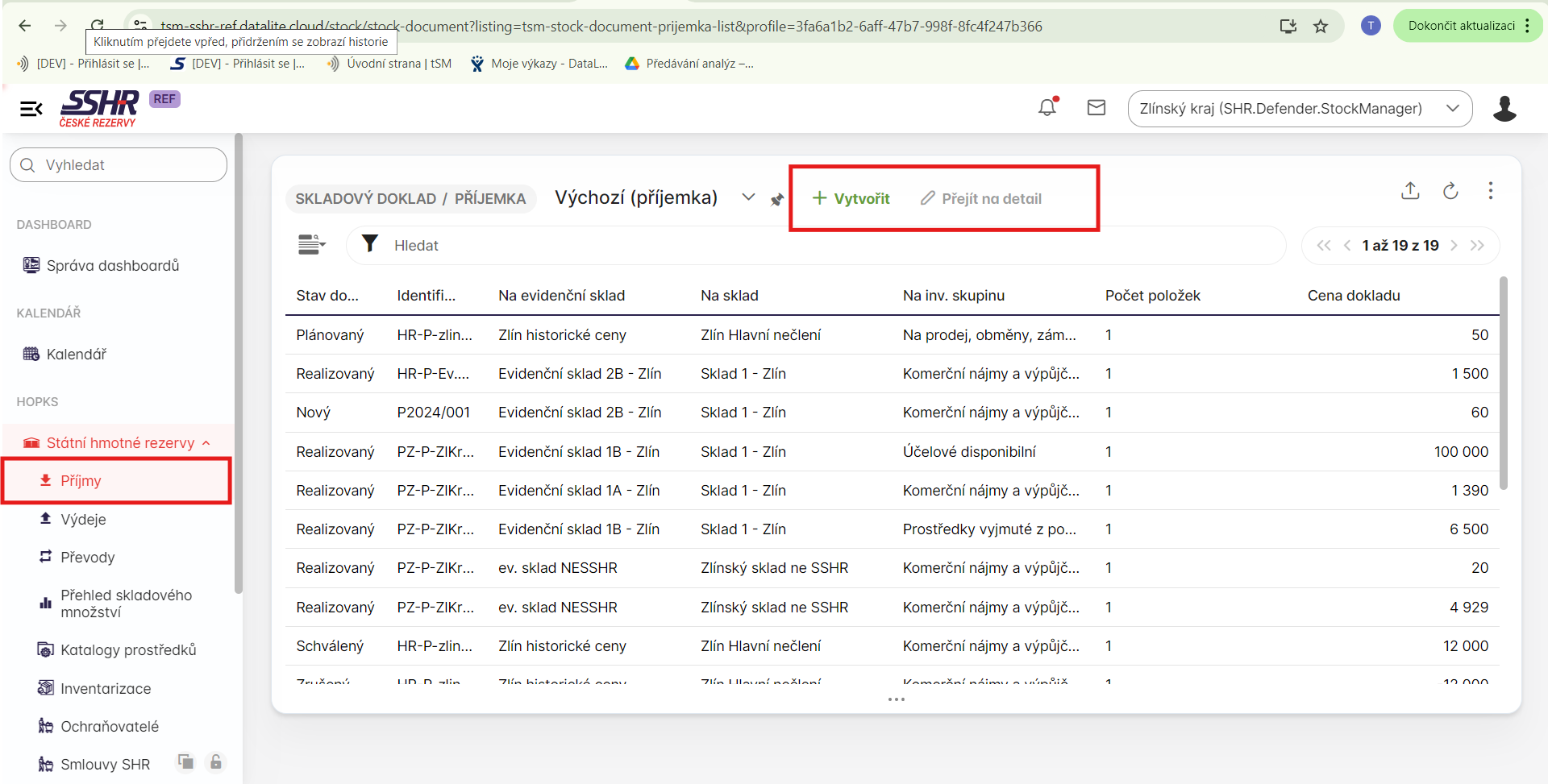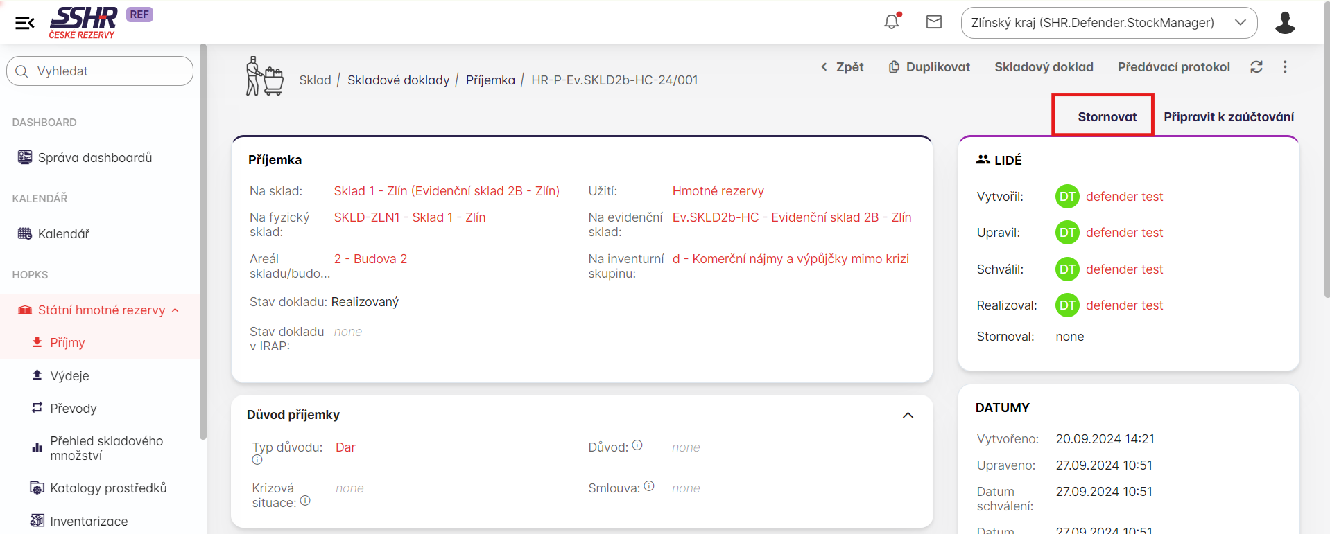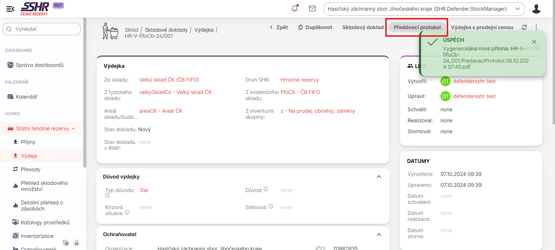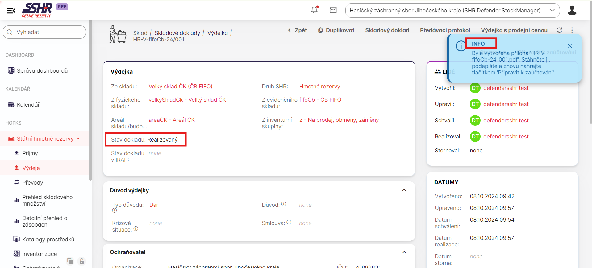 Kliknutím na "Uložit" se změní stav dokladu na "Vrácený", roli SHR.Defender.StockOperator se opět zobrazí tlačítko "Předat ke schválení" a poznámka se mu zobrazí v pravé horní části obrazovky v notifikacích. (Zvoneček)