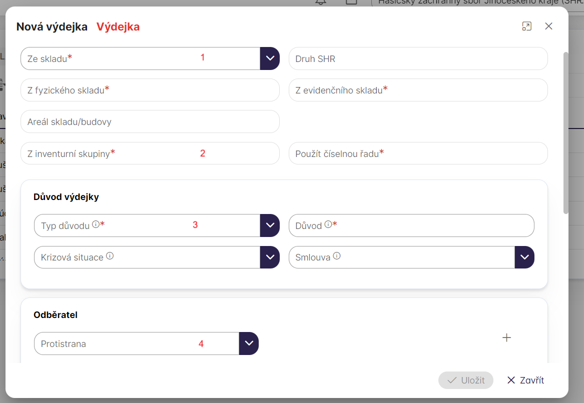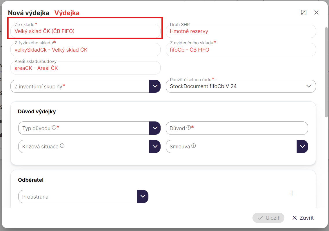 Pokud je "Účel užití" vybraného evidenčního skladu HR (hmotné rezervy) zobrazuje se navíc pole "Prodejní cena" a ta bude použita v dokladu jako cena výdeje. Pro evidenční sklad s "Účelem užití" PZ (pohotovostní rezervy" se pole "Prodejní cena" nezobrazuje.