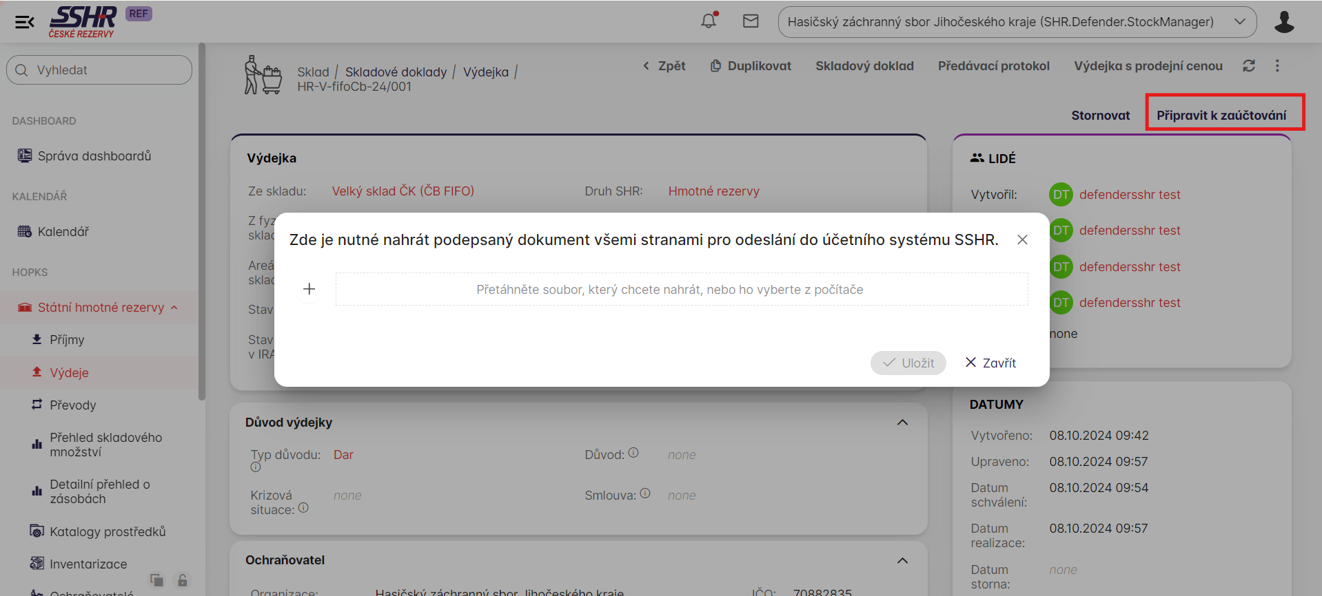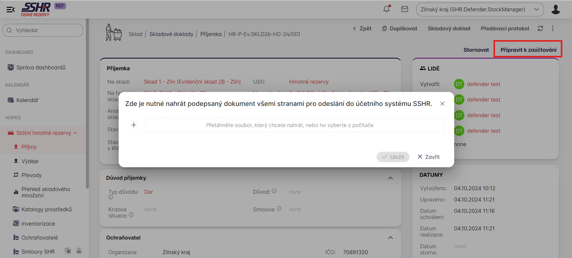 Realizováním dokladu se v pravém horním rohu nabídne roli SHR.Defender.StockManager tlačítko "Připravit k zaúčtování". Kliknutím na tlačítko se otevře formulář pro nahrání podepsaného souboru PDF, který patří realizovanému dokladu.