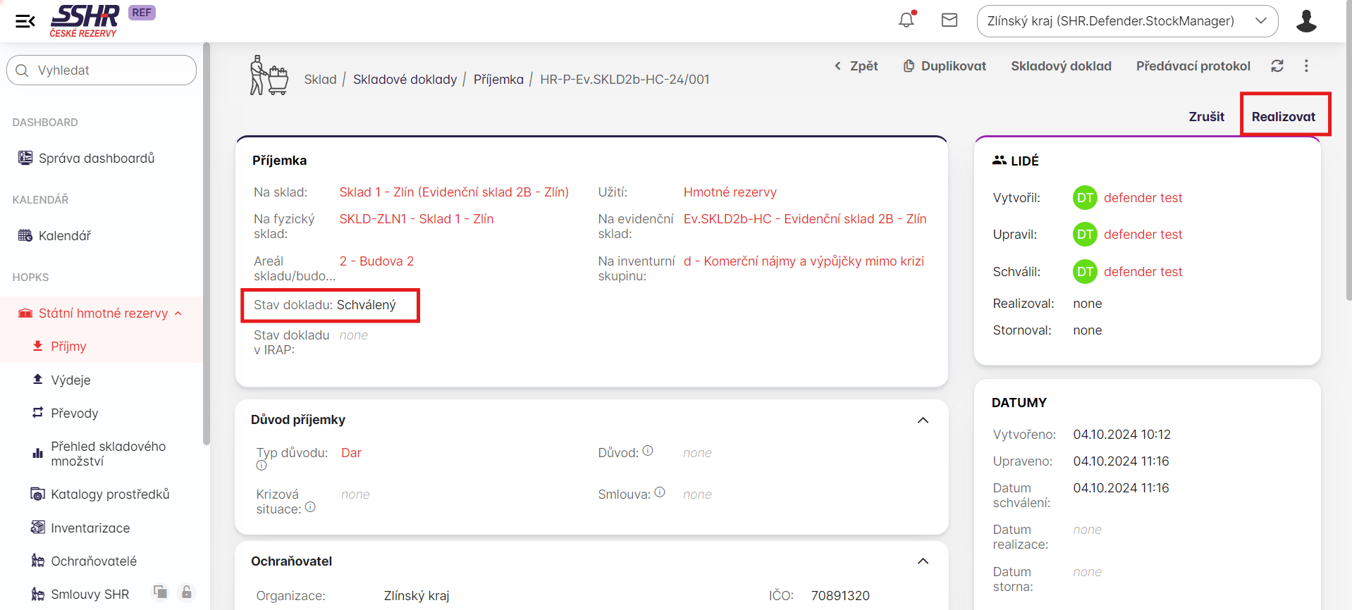 Po opravení chyby je doklad předán znovu ke schválení a pokud už nepřetrvává problém je doklad schválen SHR.Defender.StockManager -em stisknutím tlačítka "Schválit". Tlačítko "Schválit" změní stav dokladu na "Schválený" a místo "Schválit" zobrazí další tlačítko "Realizovat".