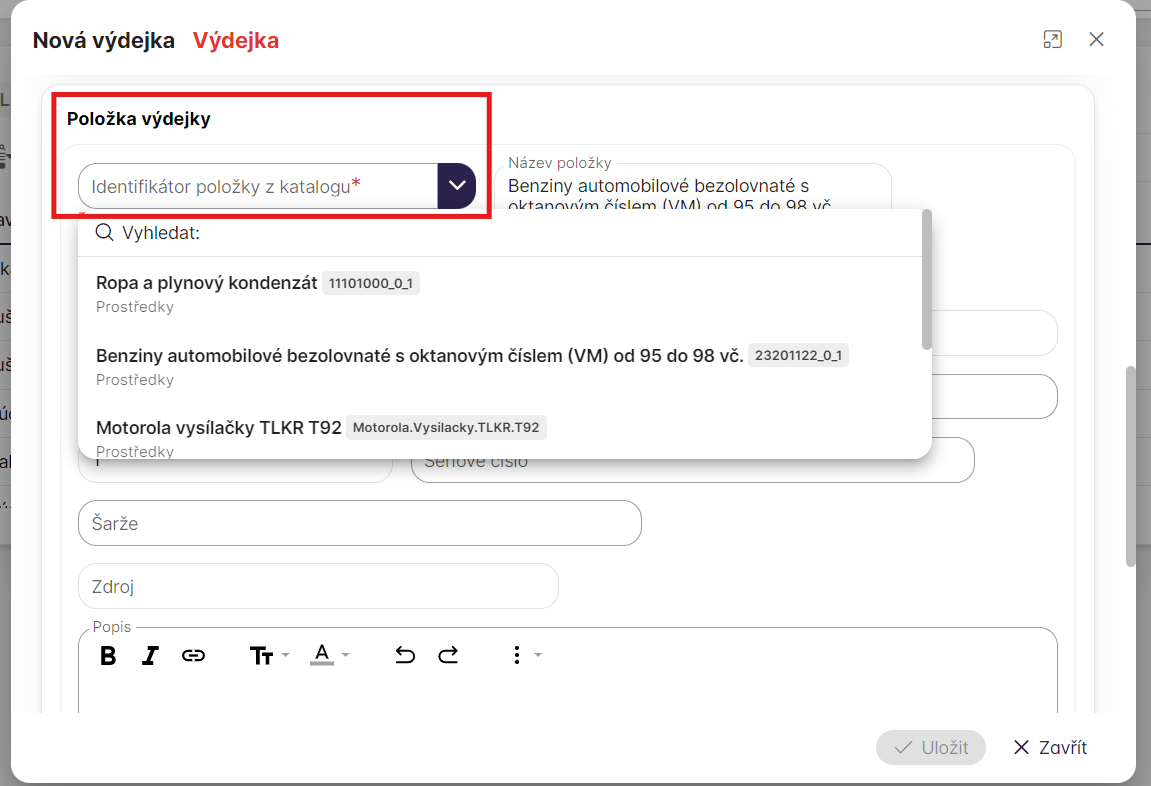 Po vybrání položky se automaticky doplní většina polí položky na základě dat z katalogu pro danou položku. Je potřeba dovyplnit pole "Množství" jako cena položky se vezme Jednotková cena, za kterou byla položka "Přijatá" na sklad.