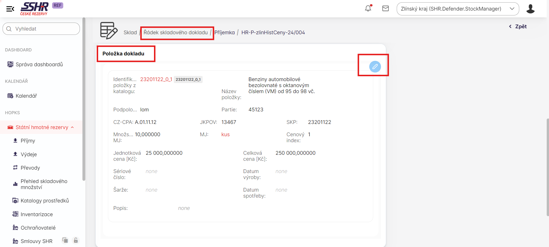 Druhá polovina obsahuje specifické informace k položce dokladu. Pokud není doklad ve stavu "Čeká na schválení", nebo i dále ve zpracování dokladu zobrazuje se na formuláři modrá editační tužka při přejetí myší přes formulář.