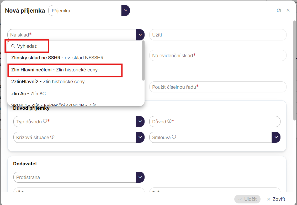 - Pole "Na sklad" - Do pole "Na sklad" se vybírá záznam odpovídající vazby mezi fyzickým a evidenčním skladem. Záznam je možné vybrat buď z roletky často používaných záznamů, která se zobrazí při kliknutí do pole, nebo z tabulky záznamů. Pro zobrazení tabulky záznamů je třeba kliknout na lupičku s popisem "Vyhledat" z roletky.