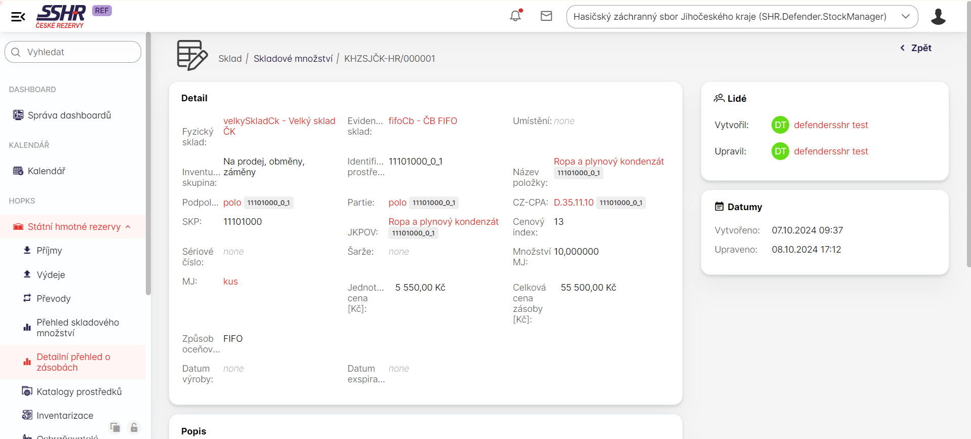 Detail záznamu detailní přehled o zásobách - Detail dílčí zásoby