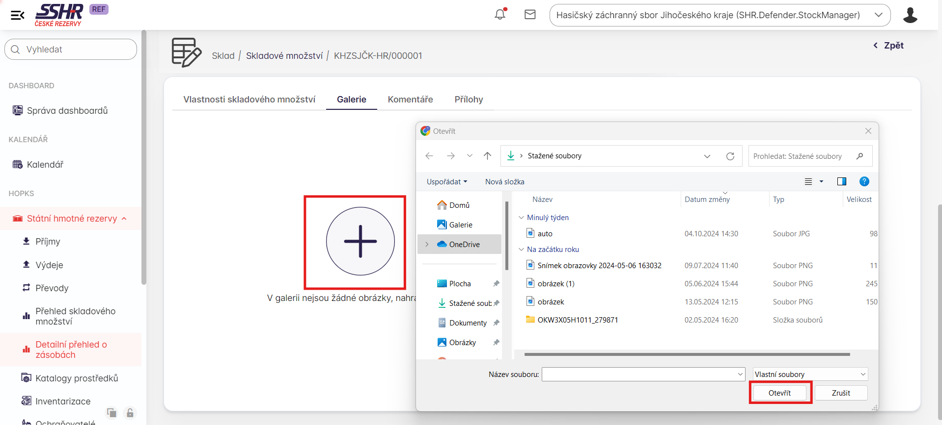 - Galerie - V záložce galerie může uživatel nahrát z úložného disku obrázek pro zásoby.