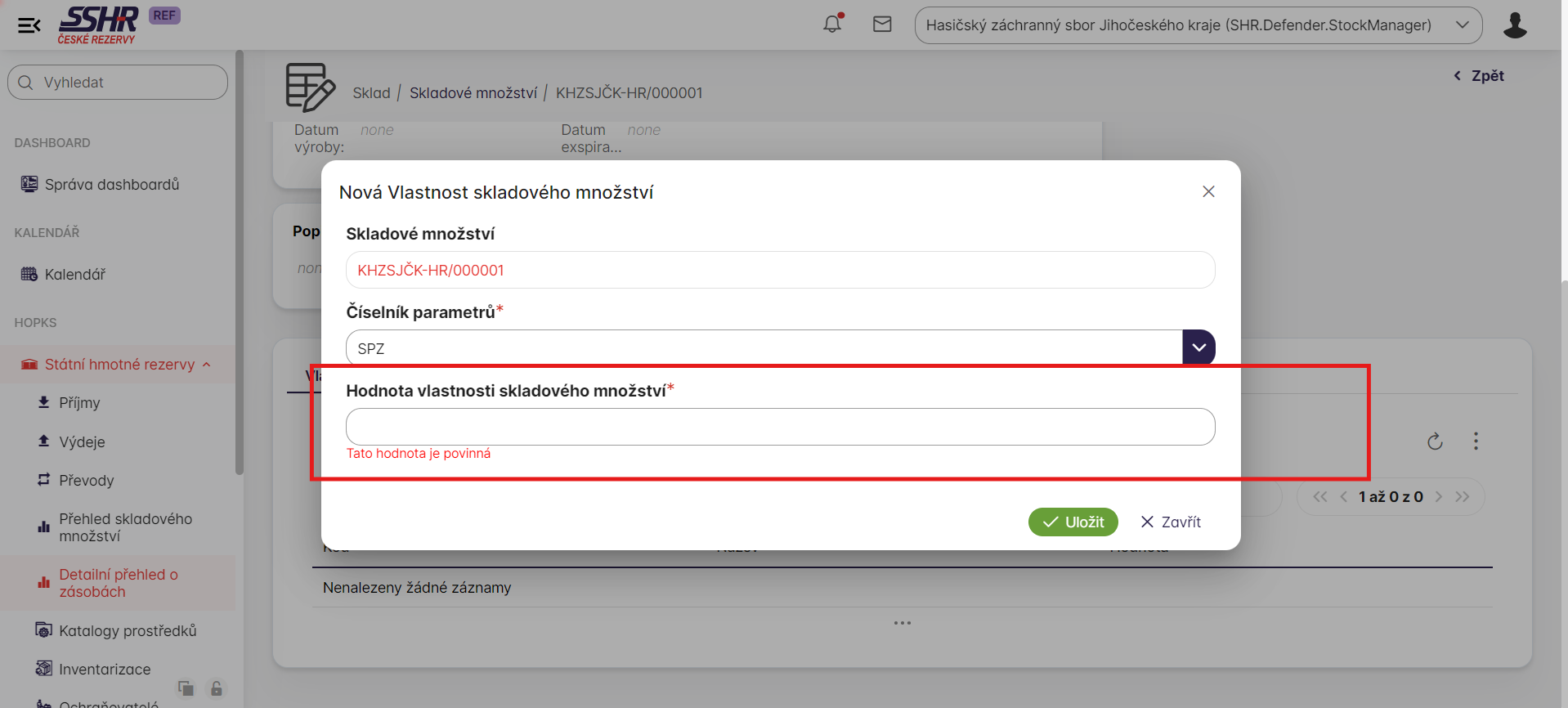 - V záložce Vlastnosti skladového množství má uživatel možnost doplnit potřebné informace položky např. požadavky na uskladnění. Stisknutím tlačítka "Vytvořit" se zobrazí formulář, do kterého je uživateli poskytnuta možnost vlastnost položky vepsat.