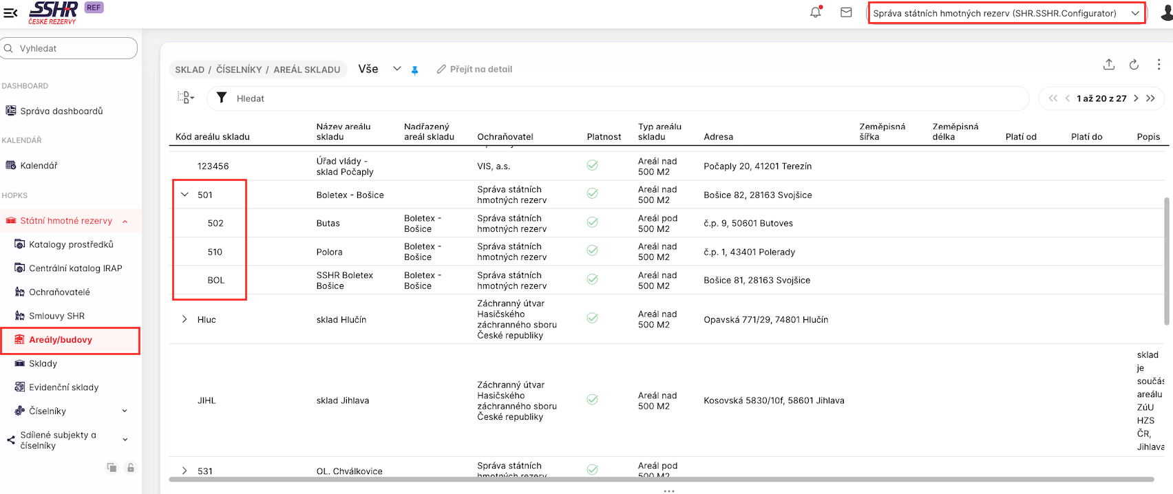 V přehledu Areály budovy je ve sloupci Kód areálu skladu zobrazena hiearchická struktura areálů. Dále uživatel vidí adresu, platnost a typ areálu. Poslední sloupec je popis, který může být delší a pak je vhodnější přepnout na zobrazení detailu.