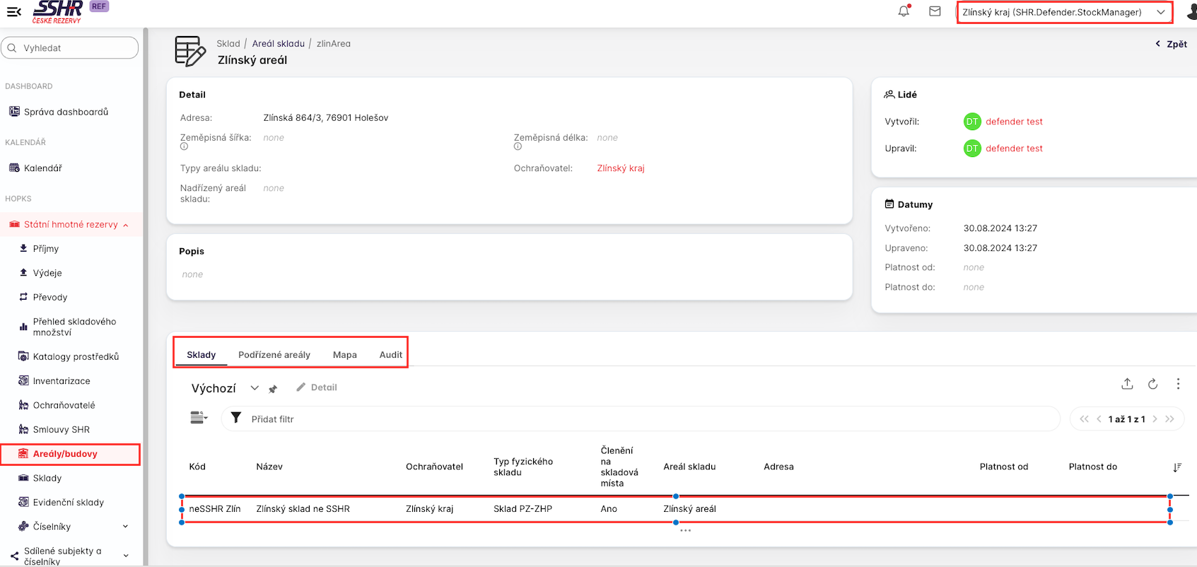 Uživatel s rolí SHR.Defender.Configurator vytváří nové areály. Pole Ochraňovatel se vyplní automaticky, uživatel toto nemůže ovlivnit či změnit.