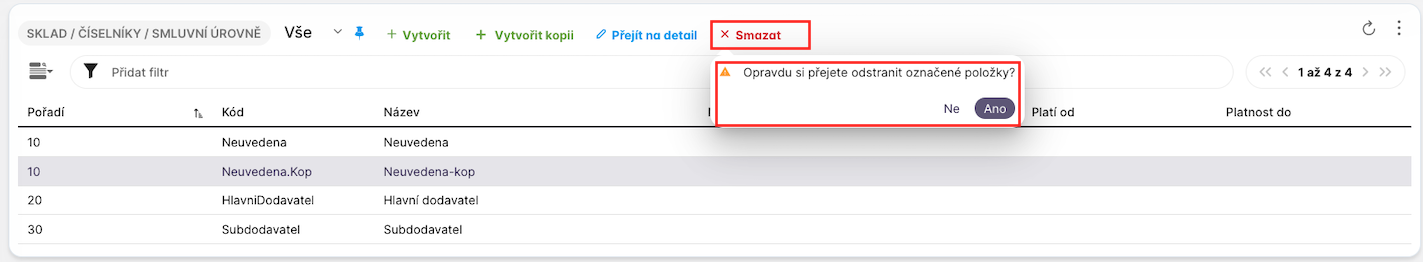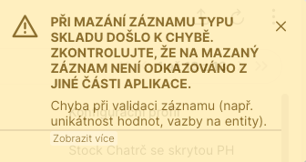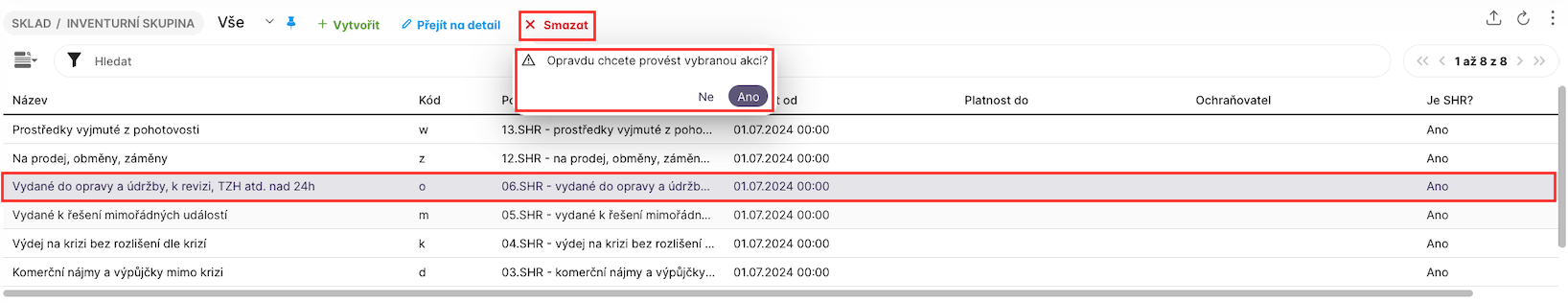 Vybrání jednoho záznamu a kliknutí na tlačítko Smazat může uživatel smazat položky Typu skladu. Uživatel následně musí potvrdit akci smazání. Pokud je číselníková hodnota již použita, není z důvodu konzistentnosti dat smazání systémemem umožněno a uživatel je informován žlutou hláškou.
