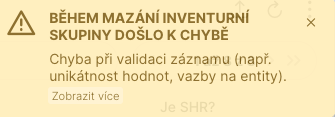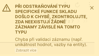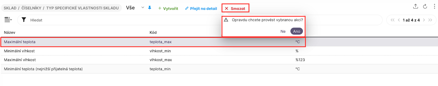 Vybrání jednoho záznamu a kliknutí na tlačítko Smazat může uživatel smazat položky Typu specifických vlastností skladu. Uživatel následně musí potvrdit akci smazání. Pokud je číselníková hodnota již použita, není z důvodu konzistentnosti dat smazání systémemem umožněno a uživatel je informován žlutou hláškou.