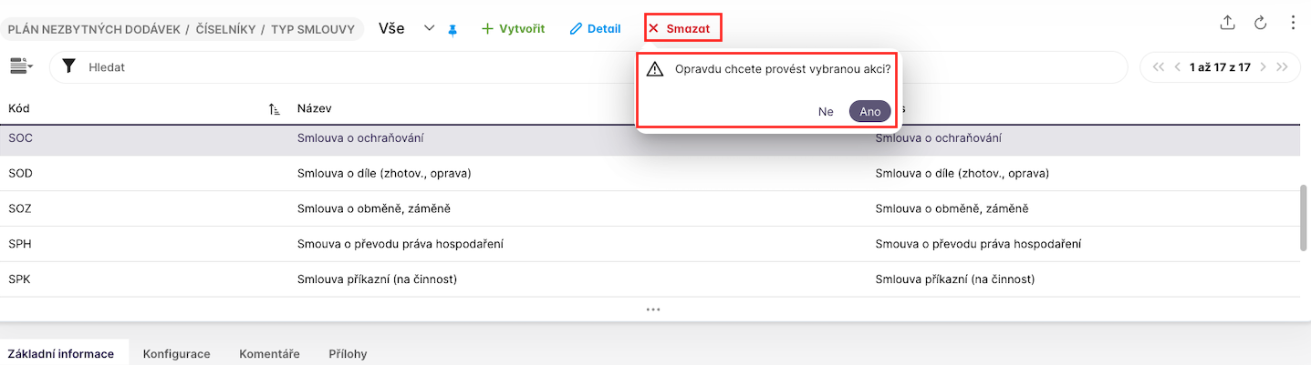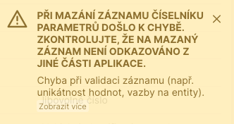 Vybrání jednoho záznamu a kliknutí na tlačítko Smazat může uživatel smazat položky Typu parametru zdroje. Uživatel následně musí potvrdit akci smazání. Pokud je číselníková hodnota již použita, není z důvodu konzistentnosti dat smazání systémem umožněno a uživatel je informován žlutou hláškou.