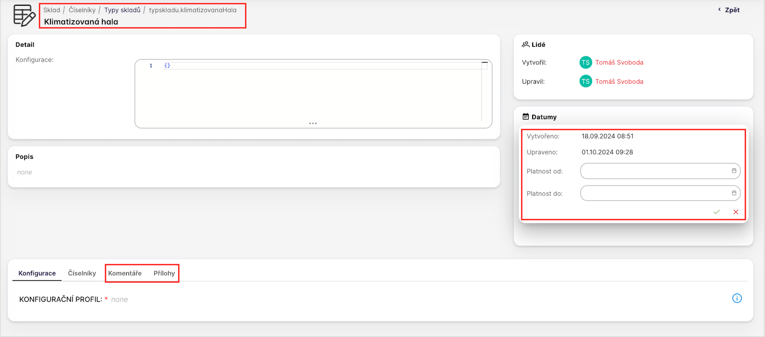 Vybrání jednoho záznamu a kliknutí na tlačítko Přejít na detail nebo vybráním dvojklikem může uživatel editovat položky Typu areálu skladu. Uživatel může: