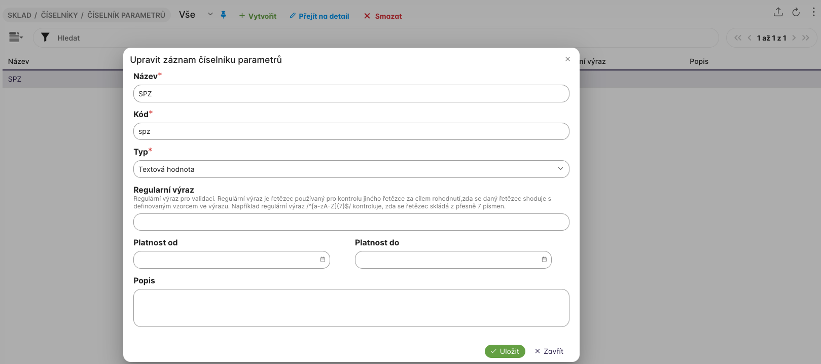 Vybrání jednoho záznamu a kliknutí na tlačítko Přejít na detail nebo vybráním dvojklikem může uživatel editovat položky Typu skladu. Uživatel může: