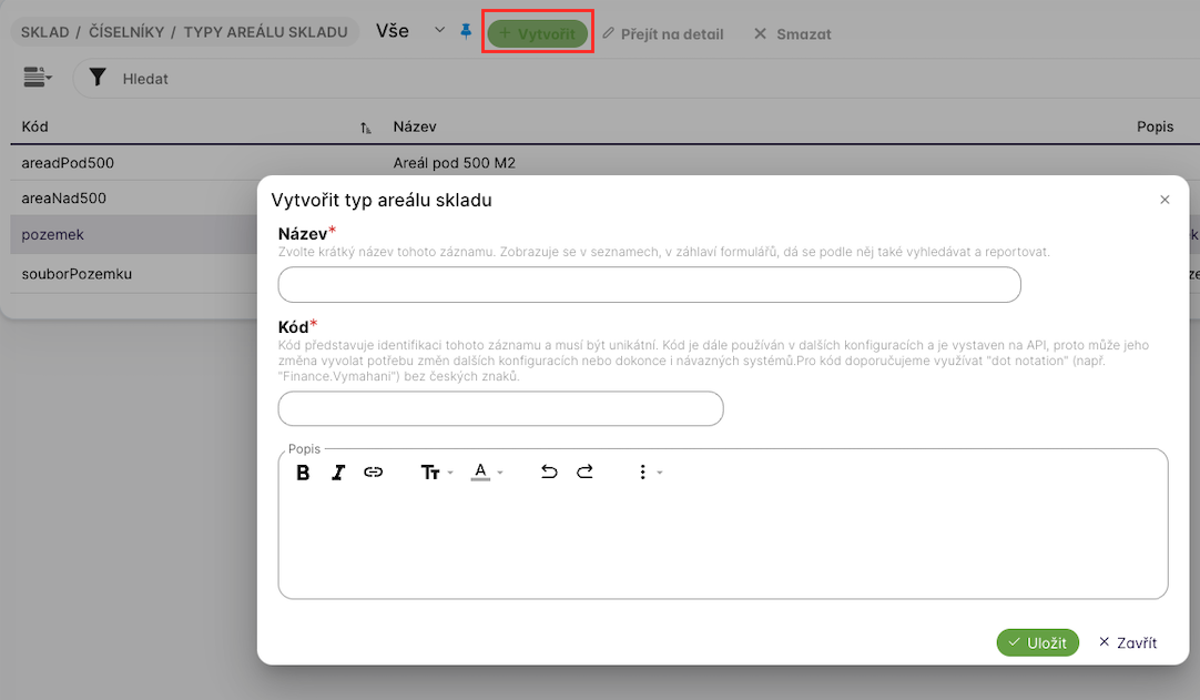 Kliknutí na tlačítko Vytvořit se uživateli zobrazí dialogové okno Vytvořit typ areálu skladu. Povinně se musí vyplnit Název a kód a je možné vyplnit popis. Popis může sloužit pro bližší specifikaci.