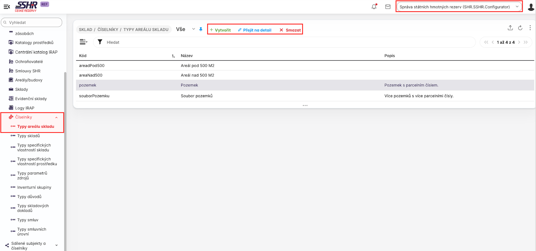 V části Státní hmotné rezervy - Číselníky může uživatel s rolí SHR.SSHR.Configurator spravovat jednotlivé záznamy pro kategorizaci areálů skladů (Areály budovy). Pouze z validních číselníkových hodnot může následně uživatel vybírat kategorie areálu skladů.