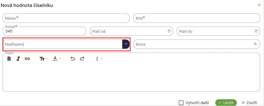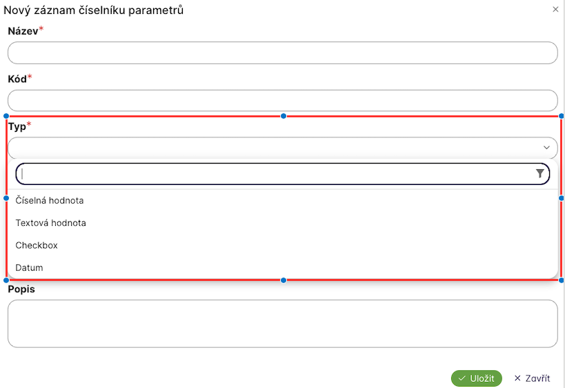 Kliknutí na tlačítko Vytvořit se uživateli zobrazí dialogové okno Nový záznam číselníku parametrů. Povinně se musí vyplnit Název a kód a je možné vyplnit popis. Popis může sloužit pro bližší specifikaci. Jako povinné pole musí být vyplněn Typ parametrů. Jedná se buď o číselnou hodnotu (umožňuje následně vložit na zdroji pouze čísla), textovou hodnotu ((umožňuje následně vložit na zdroji jakékoliv dovolené znaky - text), checkbox ((umožňuje následně vložit na zdroji hodntu ano/ne) a datum ((umožňuje následně vložit na zdroji údaje ve formátu datum z kalendáře).