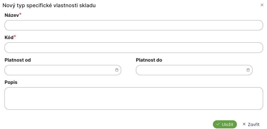 Kliknutí na tlačítko Vytvořit se uživateli zobrazí dialogové okno Vytvořit typ specifické vlastnosti skladu. Povinně se mus í vyplnit Název a kód a je možné vyplnit popis. Popis může sloužit pro bližší specifikaci. Uživatel může vyplnit i časovou platnost záznamu.