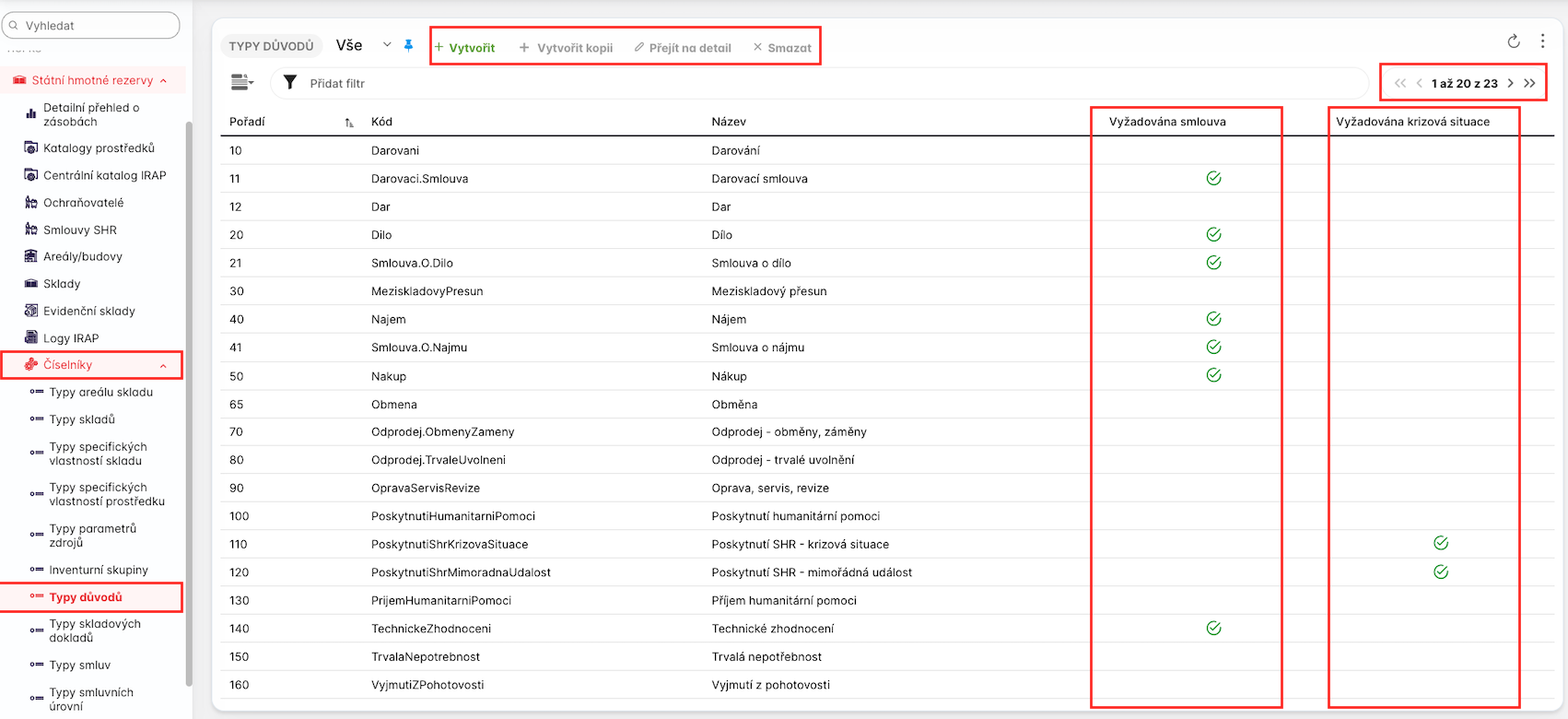 V části Státní hmotné rezervy - Číselníky může uživatel s rolí SHR.SSHR.Configurator spravovat jednotlivé záznamy pro kategorizaci specifických vlastností skladu. Pouze z validních číselníkových hodnot může následně uživatel vybírat vlastnosti skladů. Samotné použití hodnot se vyplňuje v záložce na detailu skladu.