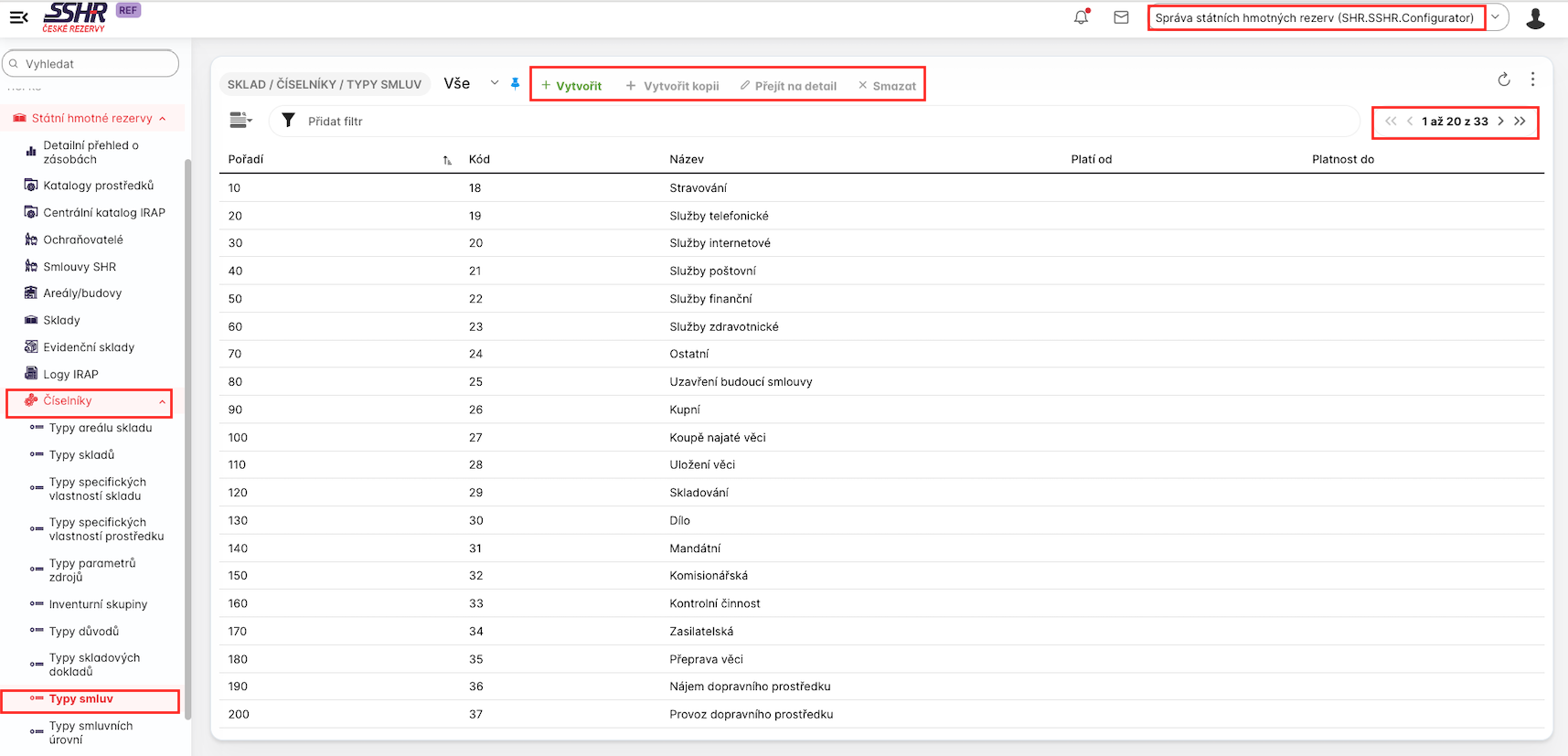 V části Státní hmotné rezervy - Číselníky může uživatel s rolí SHR.SSHR.Configurator spravovat jednotlivé záznamy pro kategorizaci skladů. Pouze z validních číselníkových hodnot může následně uživatel vybírat kategorie skladů.