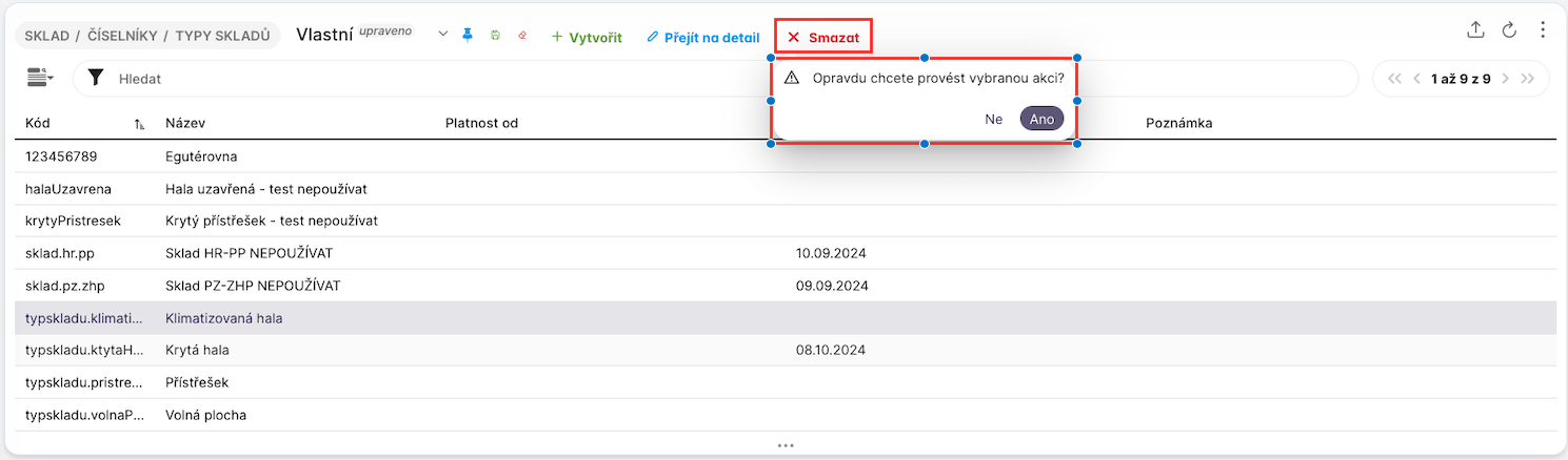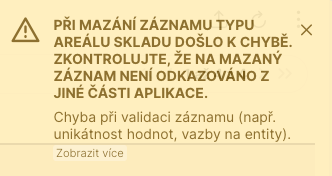 Vybrání jednoho záznamu a kliknutí na tlačítko Smazat může uživatel smazat položky Typu areálu skladu. Uživatel následně musí potvrdit akci smazání. Pokud je číselníková hodnota již použita, není z důvodu konzistentnosti dat smazání systémemem umožněno a uživatel je informován žlutou hláškou.