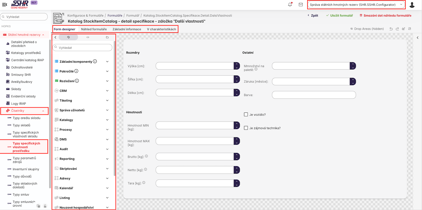 V části Státní hmotné rezervy - Číselníky může uživatel s rolí SHR.SSHR.Configurator spravovat jednotlivé záznamy pro kategorizaci specifických vlastností prostředku. Pouze z validních hodnot může následně uživatel vybírat pro zadání specifické vlastnosti prostředku na katalogu (Centrální katalog IRAP i Katalog prostředků ochraňovatele). Samotné použití hodnot se vyplňuje v záložce na prostředku katalogu. Správa tohoto číselníku patří do pokročilé konfigurace primárně určené pro správce celé aplikace. Nedoporučuje se měnit parametry pro správné fungování formuláře.