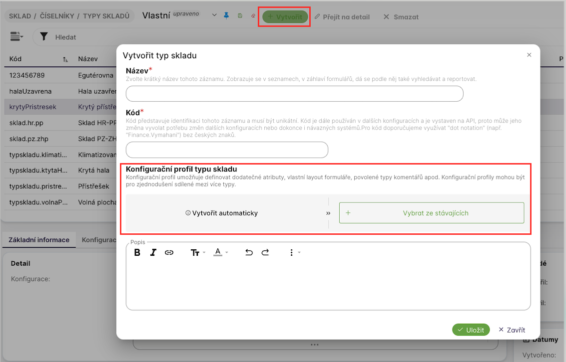 Kliknutí na tlačítko Vytvořit se uživateli zobrazí dialogové okno Vytvořit typ skladu. Povinně se musí vyplnit Název a kód a je možné vyplnit popis. Popis může sloužit pro bližší specifikaci. Uživatel ve vyznačené sekci nic needituje, tzv. konfigurační profil se vytvoří automaticky.
