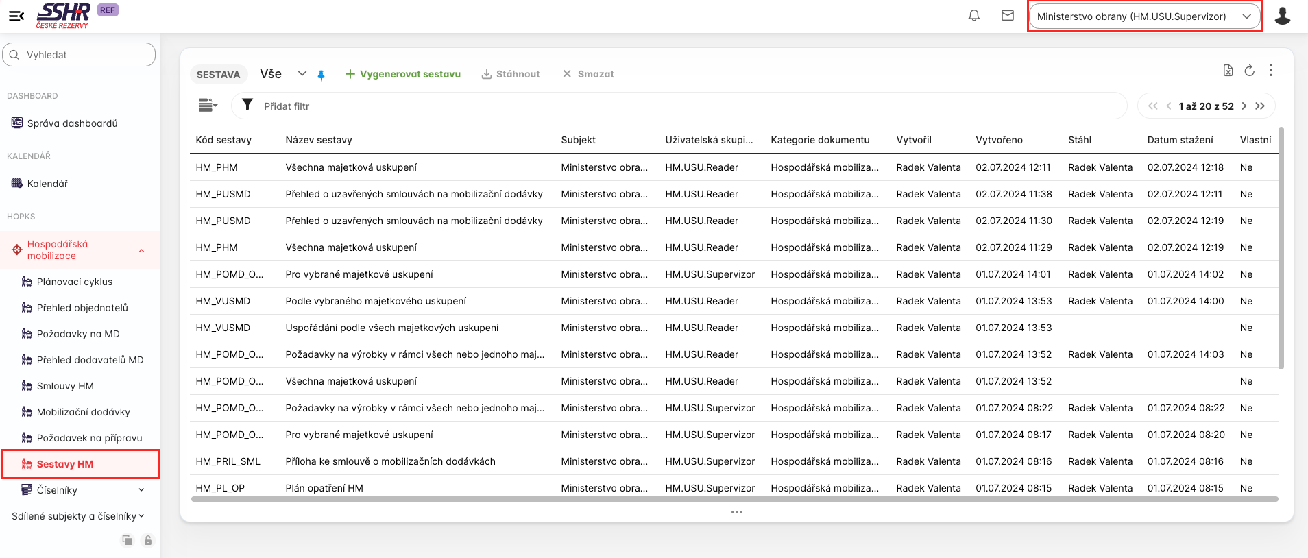 Zobrazení již vygenerovaných sestav podle přihlášeného uživatele a ÚSÚ, dodavatele nebo subjektu typu SSHR přiřazeného k přihlášenému uživateli. Vygenerované sestavy jiných subjektů se uživateli nezobrazí. V přehled Sestava jsou zobrazeny: