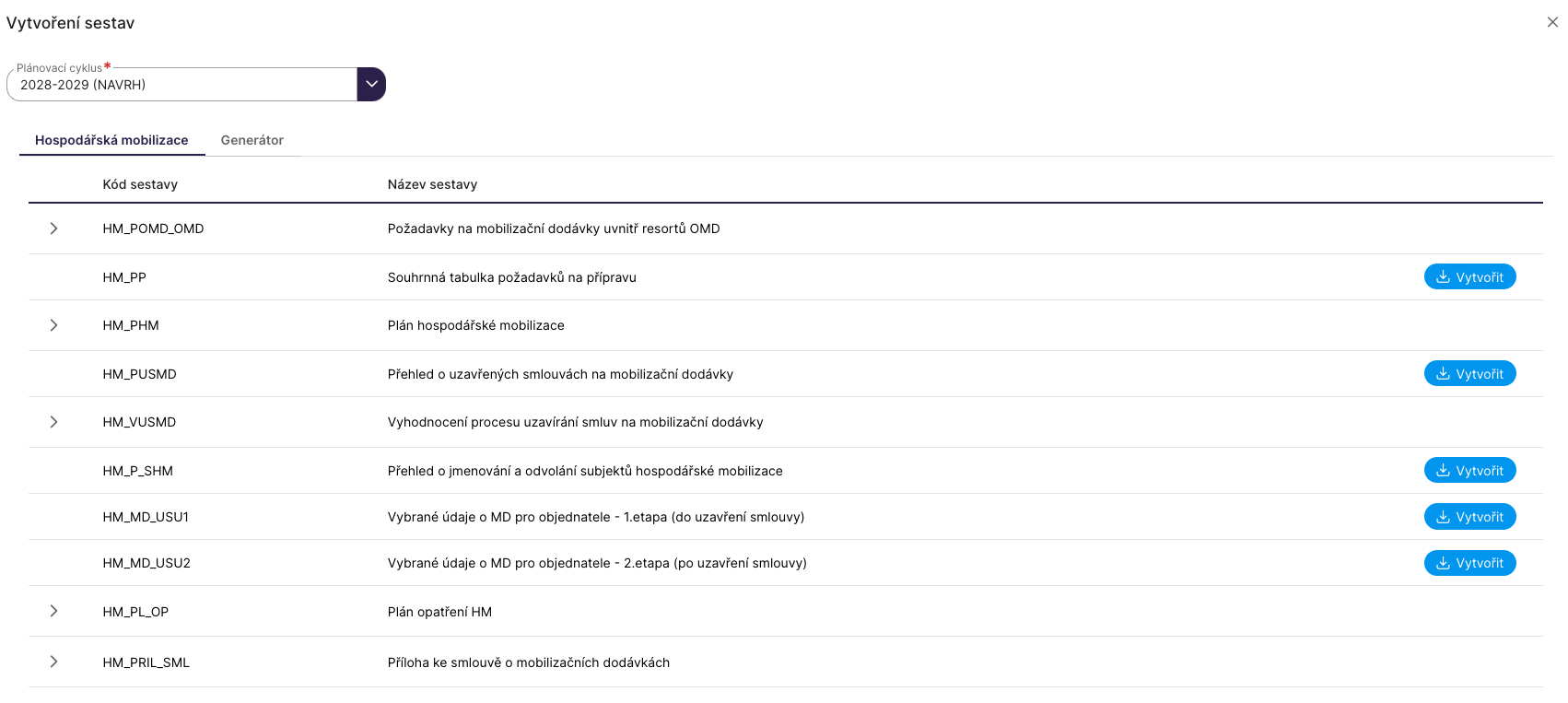 Sestava se generuje tlačítkem ##Vygenerovat sestavu.## Po jeho stisknutí se otevře tabulka pro definování toho, jakou sestavu si přeje uživatel vygenerovat. Uživatel musí vybrat plánovací cyklus, za který chce sestavu generovat. Každá z uživatelských skupin (role v modulu Hospodářská mobilizace) může mít své kategorie a druhy sestav k vygenerování.