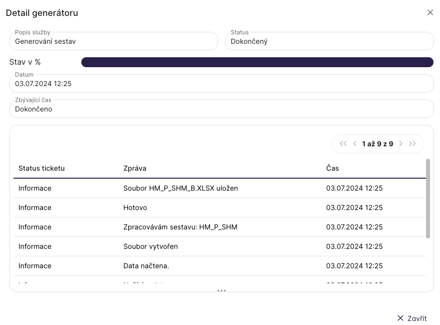 Zde je možné sledovat průběh generování sestavy a také výsledek generování.