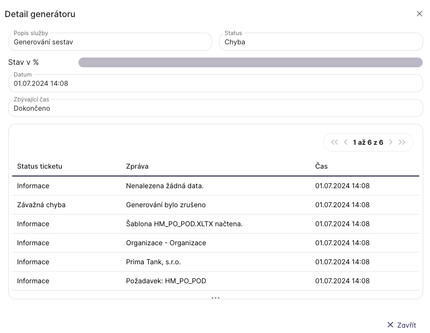 Dvojklikem na řádek v seznamu Generátor se zobrazí detail přehled kroků generování, vč. typu chyby.