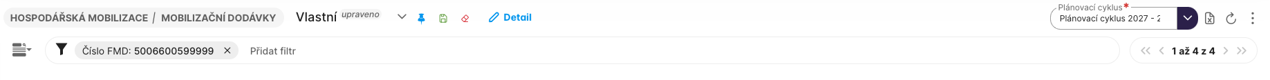 Kliknutí do řádku filtru může uživatel zvolit jen mobilizační dodávky jednoho řetězce. Vybere filtr Číslo FMD a zadá hodnotu nebo vybere filtr Název FMD a zadá hodnotu názvu