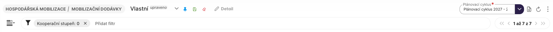 Kliknutí do řádku filtru může uživatel zvolit jen finální mobilizační dodávky. Vybere filtr Kooperační stupeň a zadá hodnotu "0"