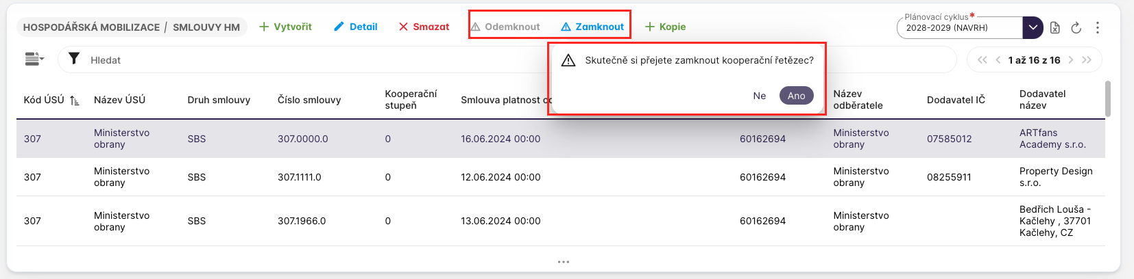 Uživatel s přiřazenou rolí HM.USU.Supervizor může vybrat jeden záznam smlouvy s kooperačním stupněm "0", tj. takovou smlouvu, ve které je objednatelem a stisknutím tlačítka Zablokovat a potvrzením možnosti Ano, zamkne celý kooperační řetězce.