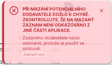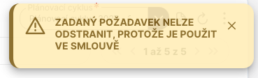 Pokud je požadavek přiřazen k řádku smlouvy, není možné požadavek na MD smazat, systém po potvrzením možnosti Ano zobrazí hlášku: