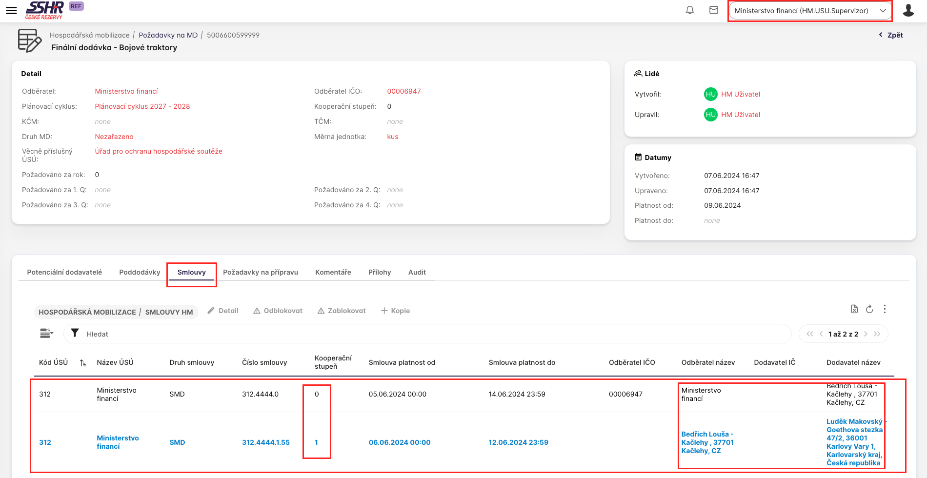 Na detailu požadavku na MD je možné vybráním záložky Smlouvy zobrazit smlouvy, které se váží k vybranému požadavku na MD. Přehled obsahuje jak finální smlouvu (kooperační stupeň "0"), tak i smlouvy nižších stupňů, včetně identifikace smlouvy a identifikace objednatele a dodavatele.