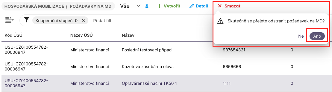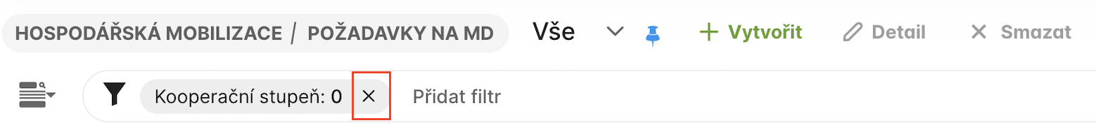 Výchozí zobrazení obsahuje pouze požadavky na MD nultého "0" kooperačního stupně, kdy jsou to všechno požadavky vytvořené ÚSÚ přihlášeného uživatele. Zrušením filtru Kooperační stupeň: 0 kliknutím na X se zobrazí všechny požadavky, tedy i nižšího stupně vážící se k požadavkům objednatele (ÚSÚ).
