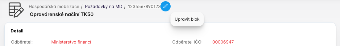 Po vytvoření nového požadavku na MD nebo po vybrání konkrétního požadavku v přehledu požadavků může uživatel editovat detail požadavku najetím kurzoru a kliknutím na ikonu editační tužky vpravo nahoře Sekce Detaily.
