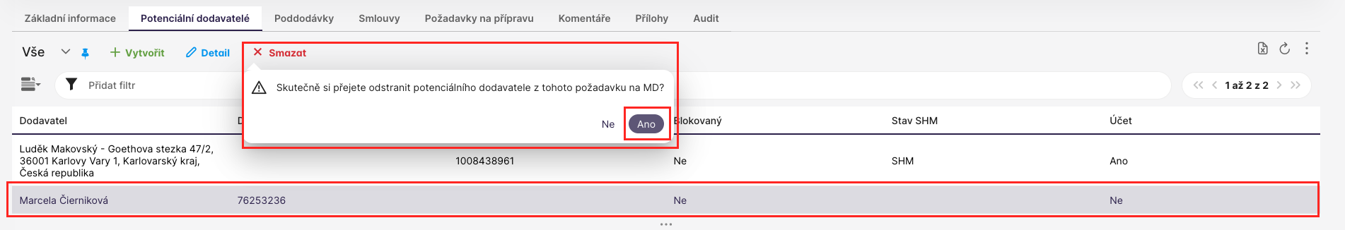Vybráním potenciálního dodavatele a kliknutím na tlačítko smazat a následném potvrzením možnosti Ano uživatel Smaže potenciálního dodavatele. Touto akcí neodstraňuje subjekt nebo organizační složku podniku z aplikace či z jiného požadavku na MD, pouze se odstraní vazba mezi požadavkem na MD a smazaným potenciálním dodavatelem.