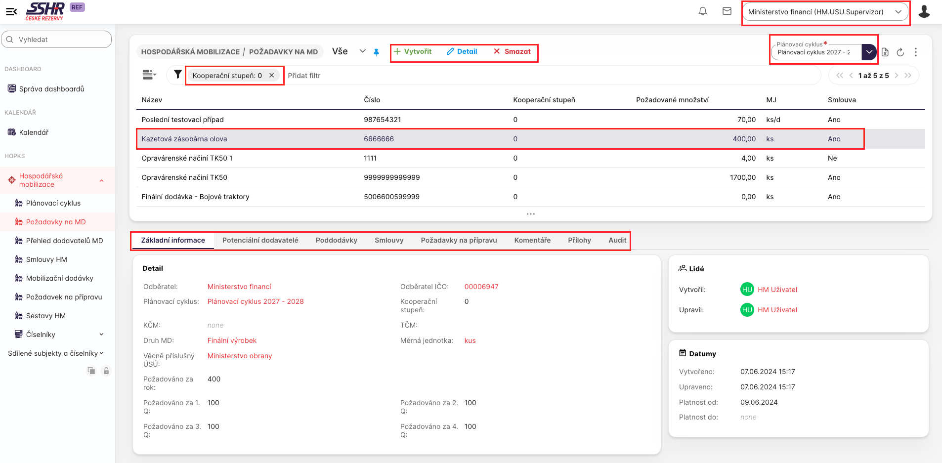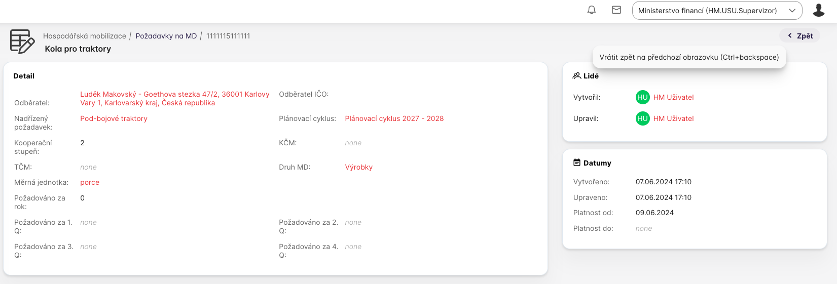 Vybráním jednoho záznamu požadavku na MD se zobrazí v dolní části obrazovky detail požadavku na MD. Tuto funkcionalitu mají přístupnou všechny základní role modulu Hospodářská mobilizace.