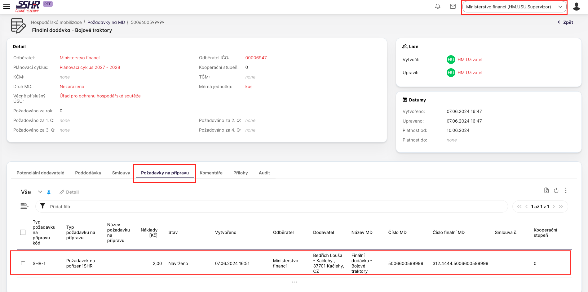 Přehled požadavků na MD pro uživatele s rolí HM.ÚSÚ.Supervizor nebo Reader obsahuje pouze požadavky, které v daném plánovacím období vytvořil ÚSÚ přihlášeného uživatele.