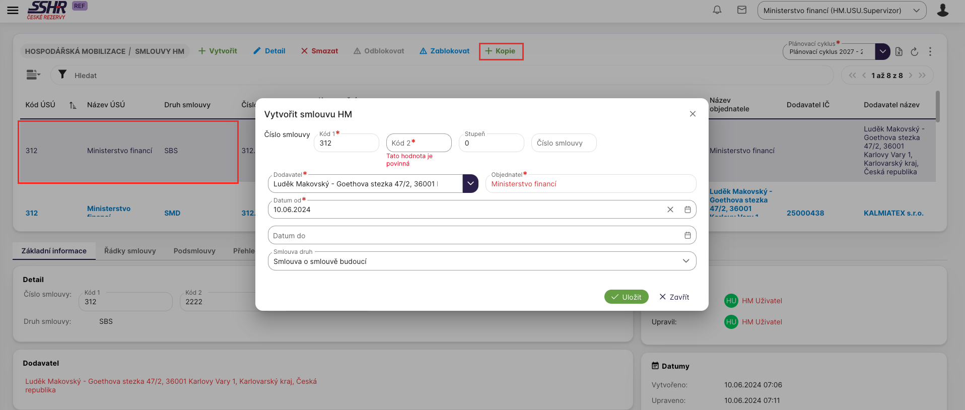 Uživatel s přiřazenou rolí HM.USU.Supervizormůže vybrat existující smlouvu a údaje o ní kopírovat do nové. Tlačítkem Kopie se uživateli zobrazí formulář s vyplněnými hodnotami zdrojové smlouvy.
